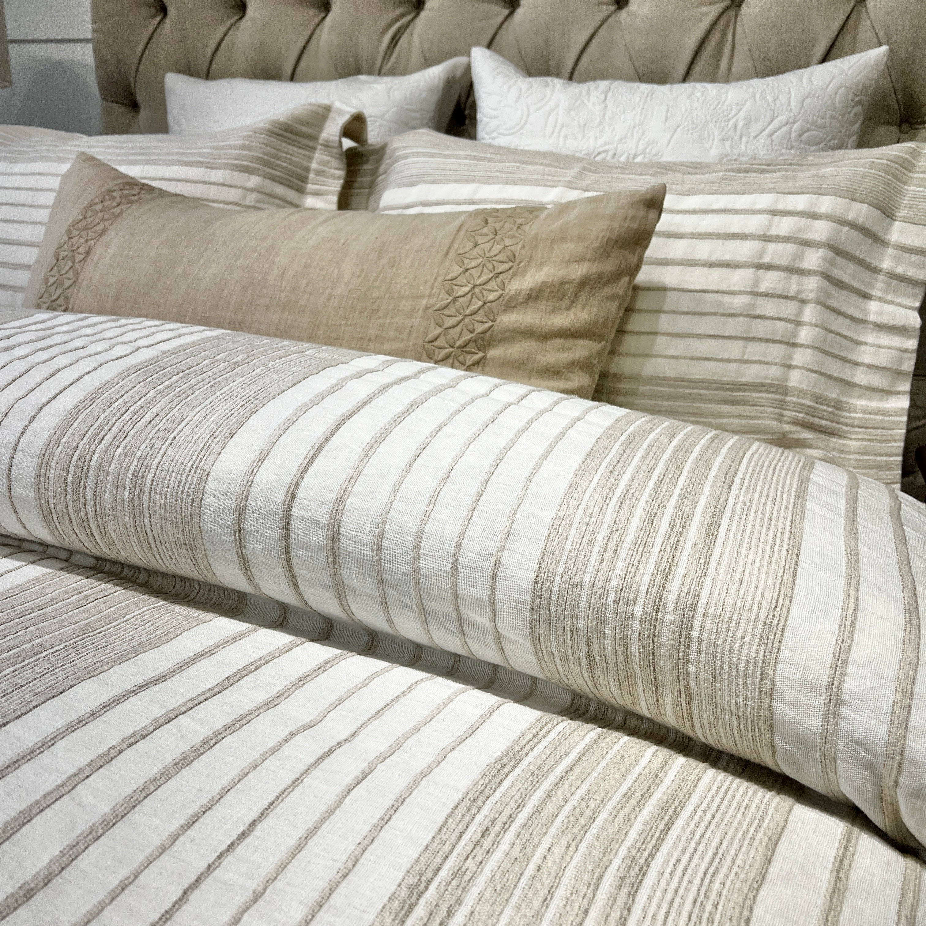 Introducing our linen collection, featuring vibrant colours and captivating textures to elevate your home décor. Explore our range of meticulously crafted Universal quilts, Comforters, Bedspreads, Cushions, Throws, and Table Linen, designed exclusively for McPhails by our Australian designer. Each piece is handcrafted by skilled Artisans using premium natural fibres, blending contemporary design with timeless elegance.
