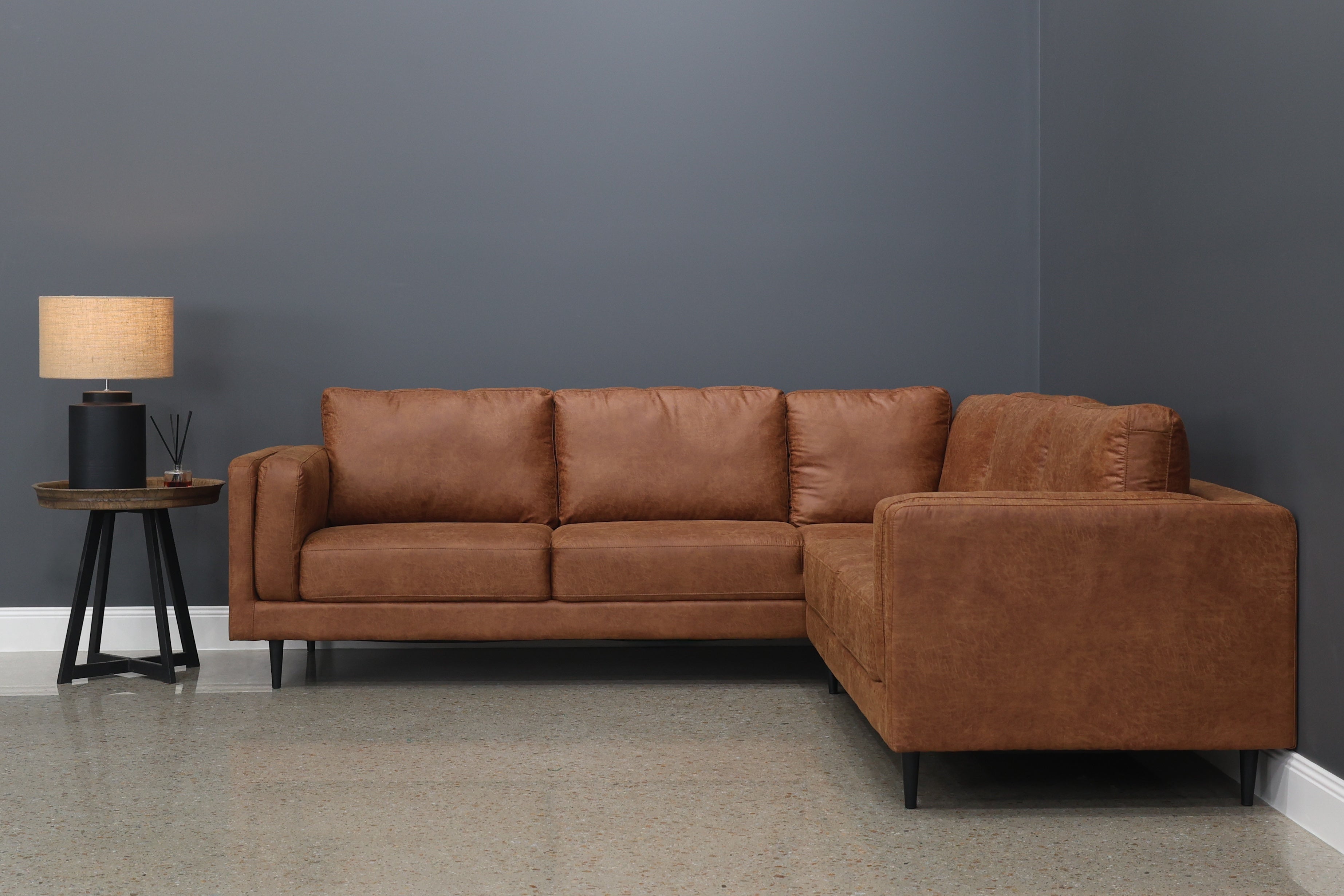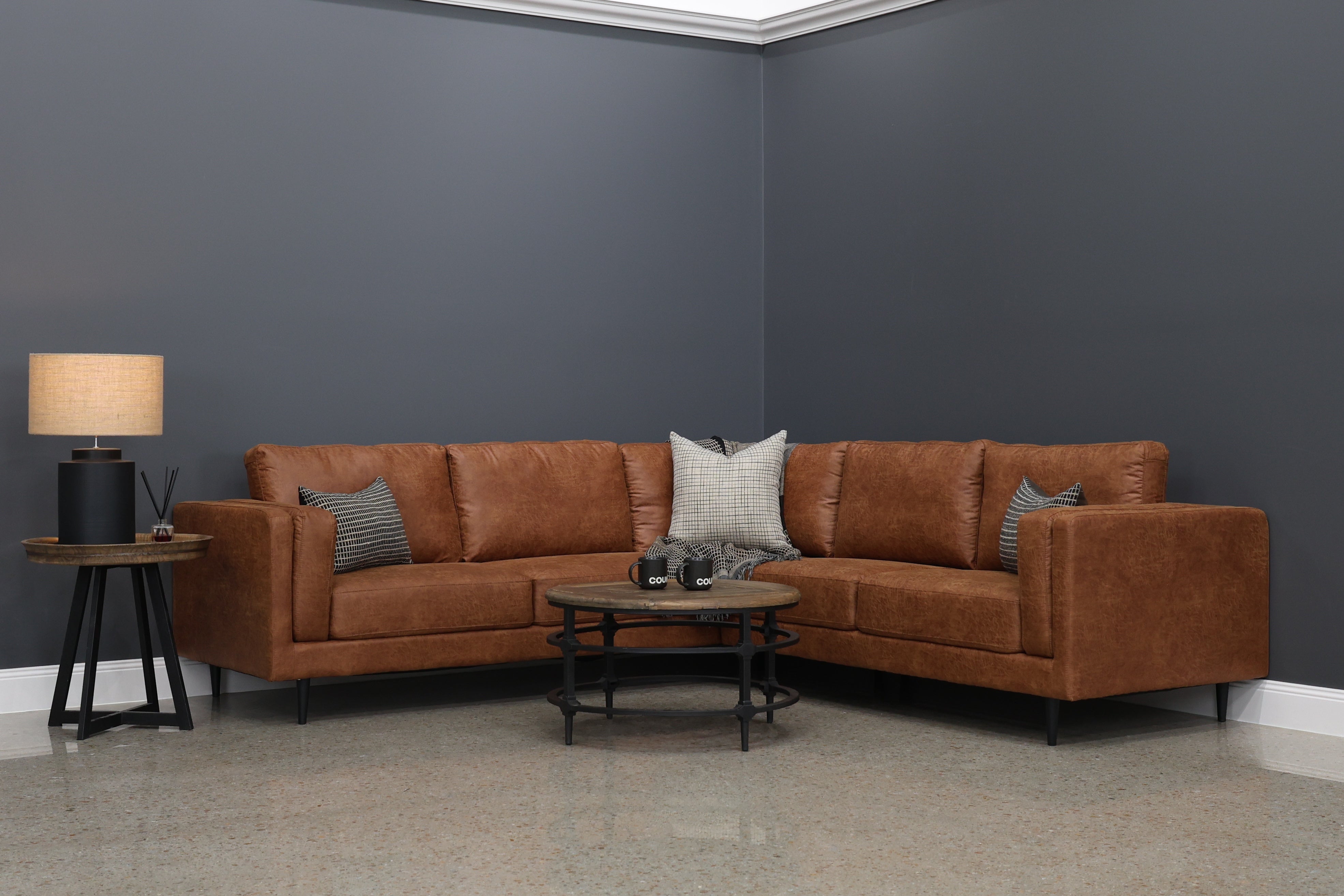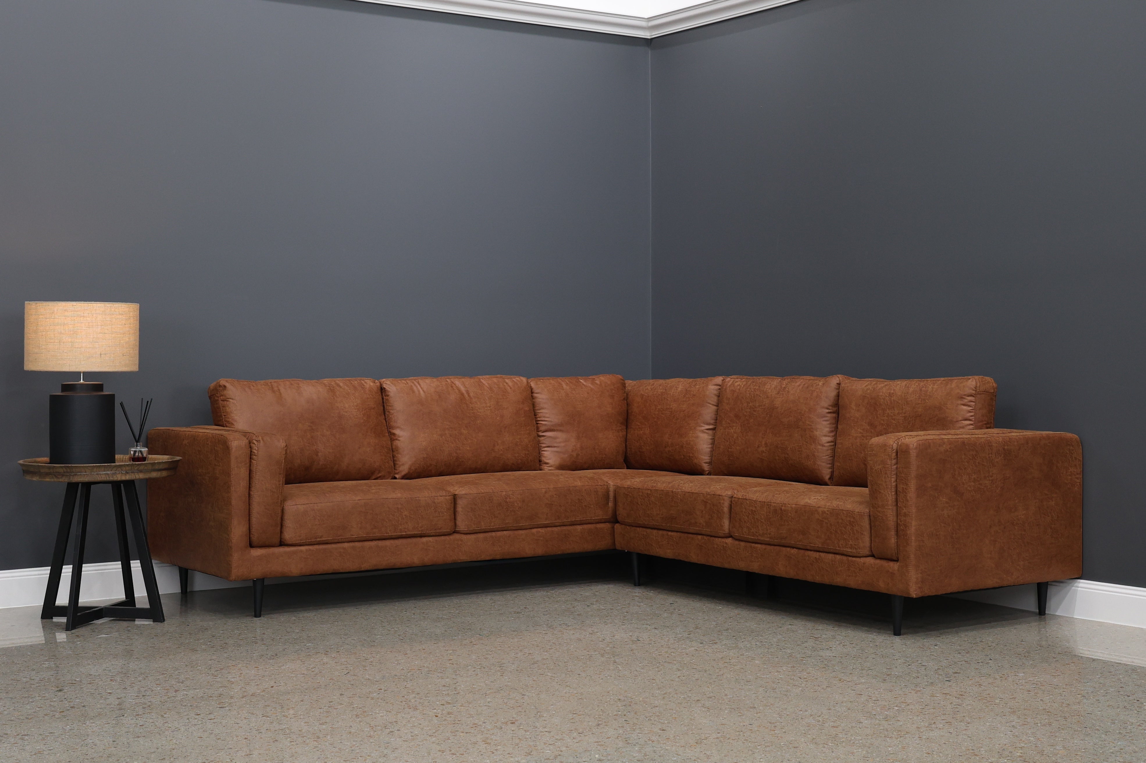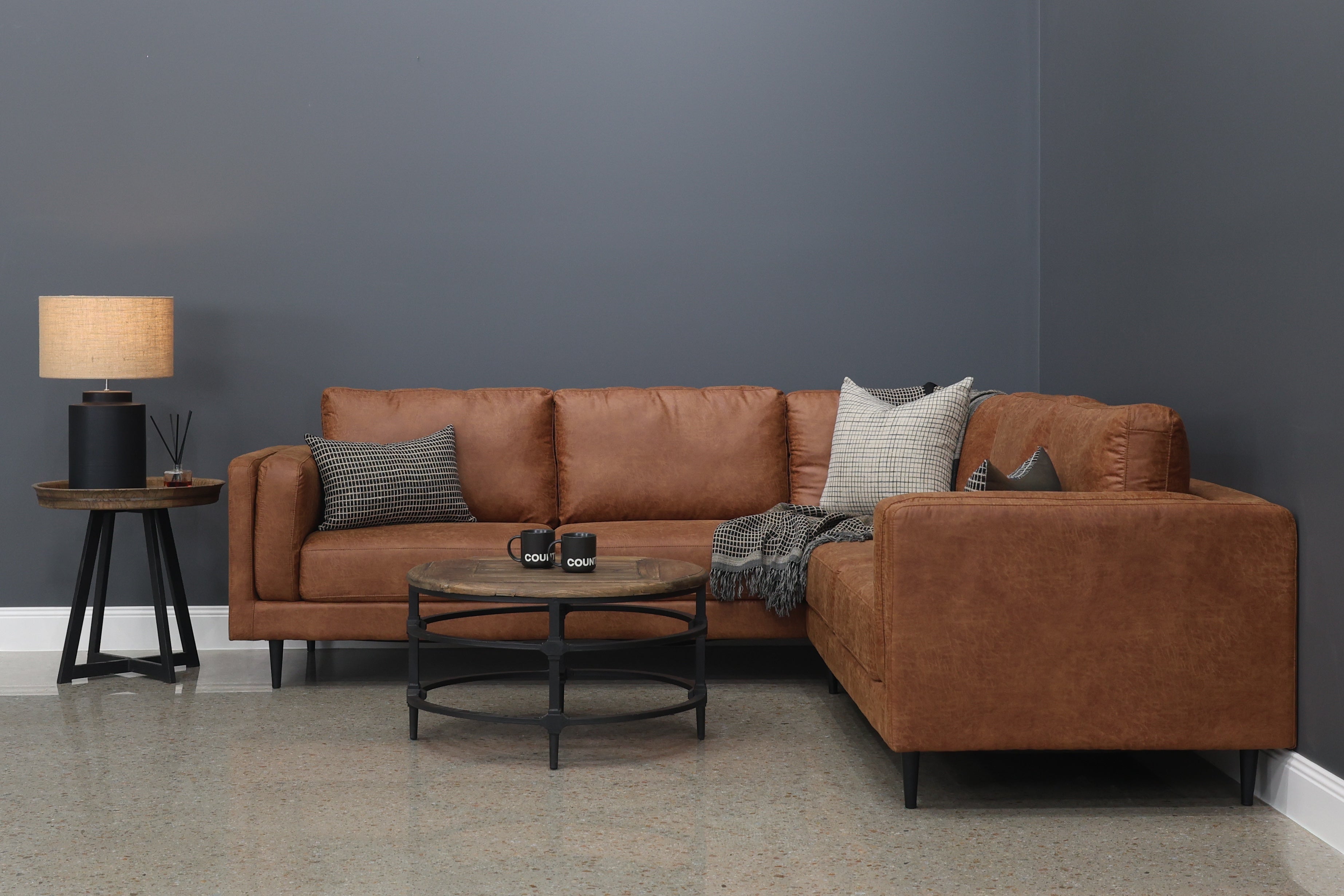 Sink into its plush pillow arm design, offering a cosy embrace like no other. The added touch of black metal legs not only elevates its appearance but also reinforces its sturdy steel frame construction, ensuring durability for years to come. Upholstered in a beautifully soft leather air fabric that feels luxurious to the touch and is available in three different colours, the Canberra Corner Lounge effortlessly blends into any home decor.