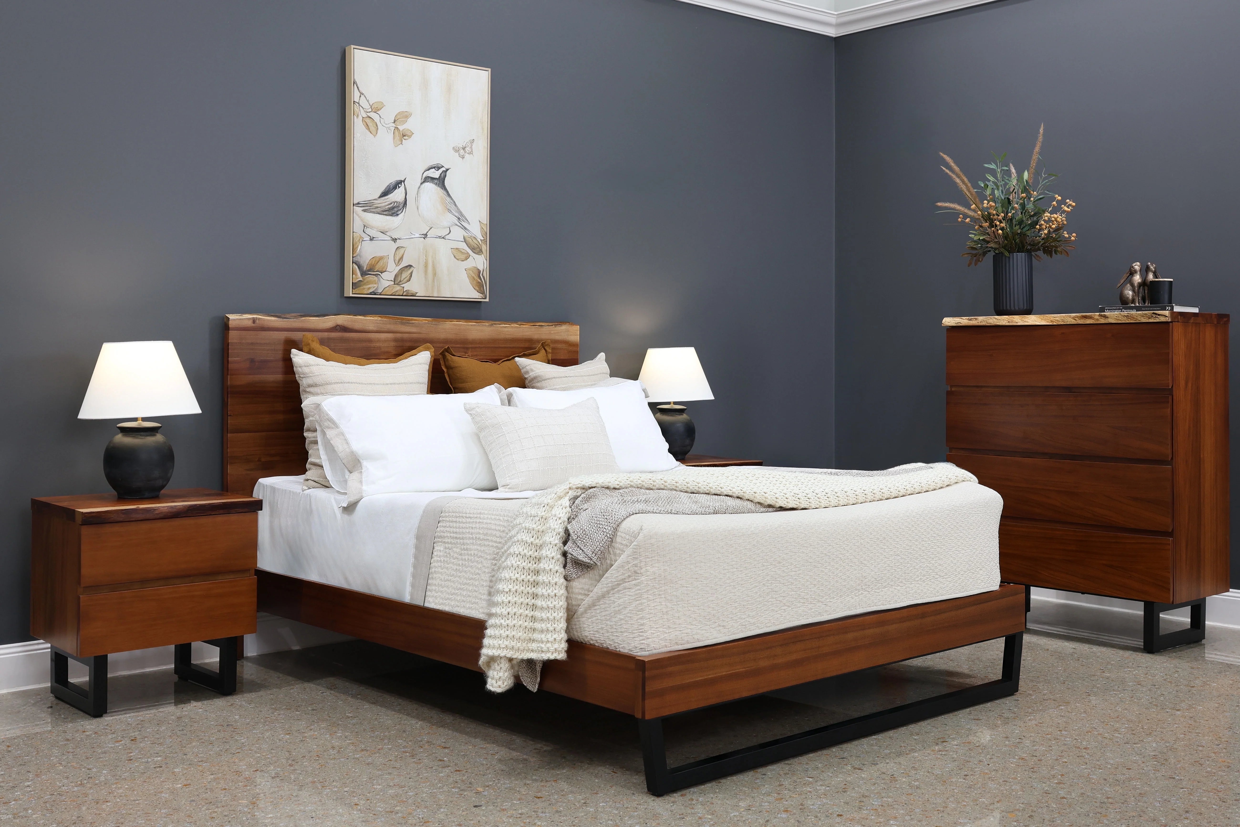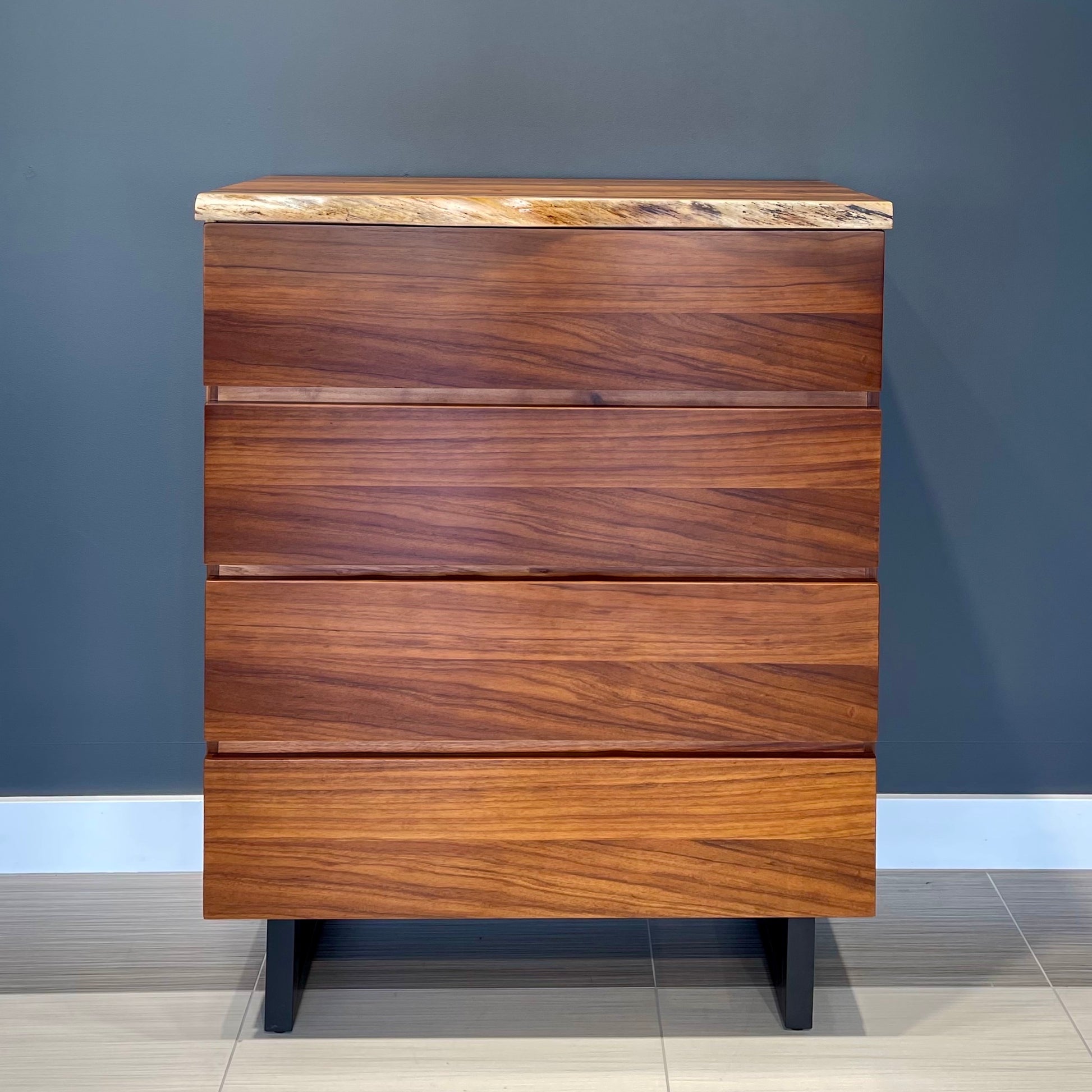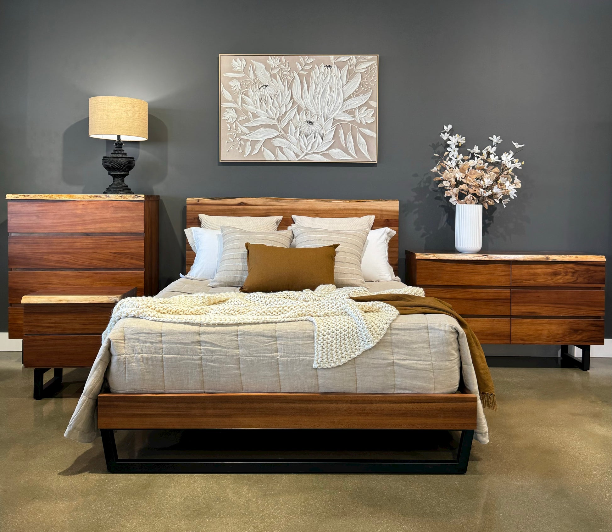 The Dark Valley Tallboy offers a stylish and practical storage solution for your bedroom, blending rustic charm with modern design. Expertly crafted from premium Blackwood timber, it showcases the natural grain patterns and unique feature edges, making each piece one of a kind. Supported by sleek black aluminium legs, this tallboy combines timeless craftsmanship with contemporary functionality.