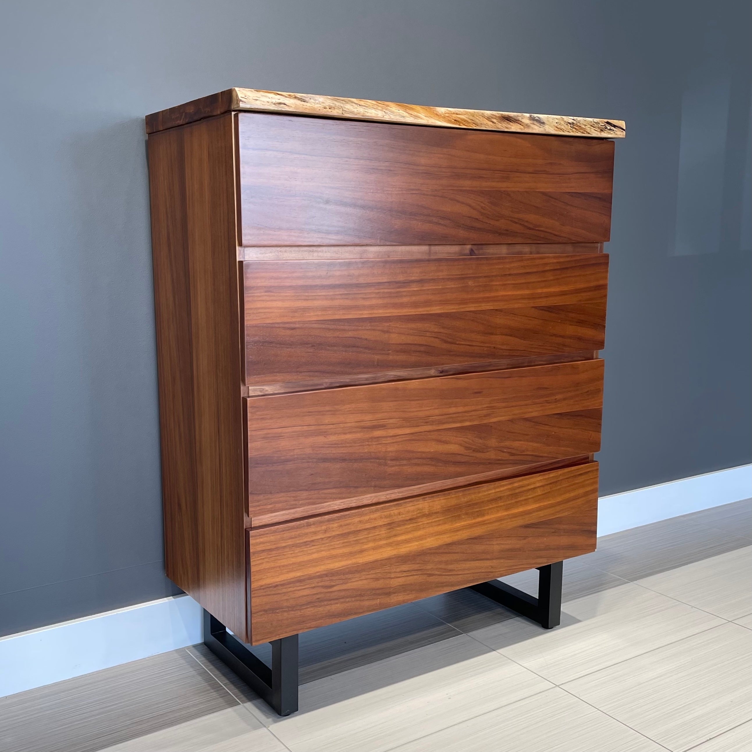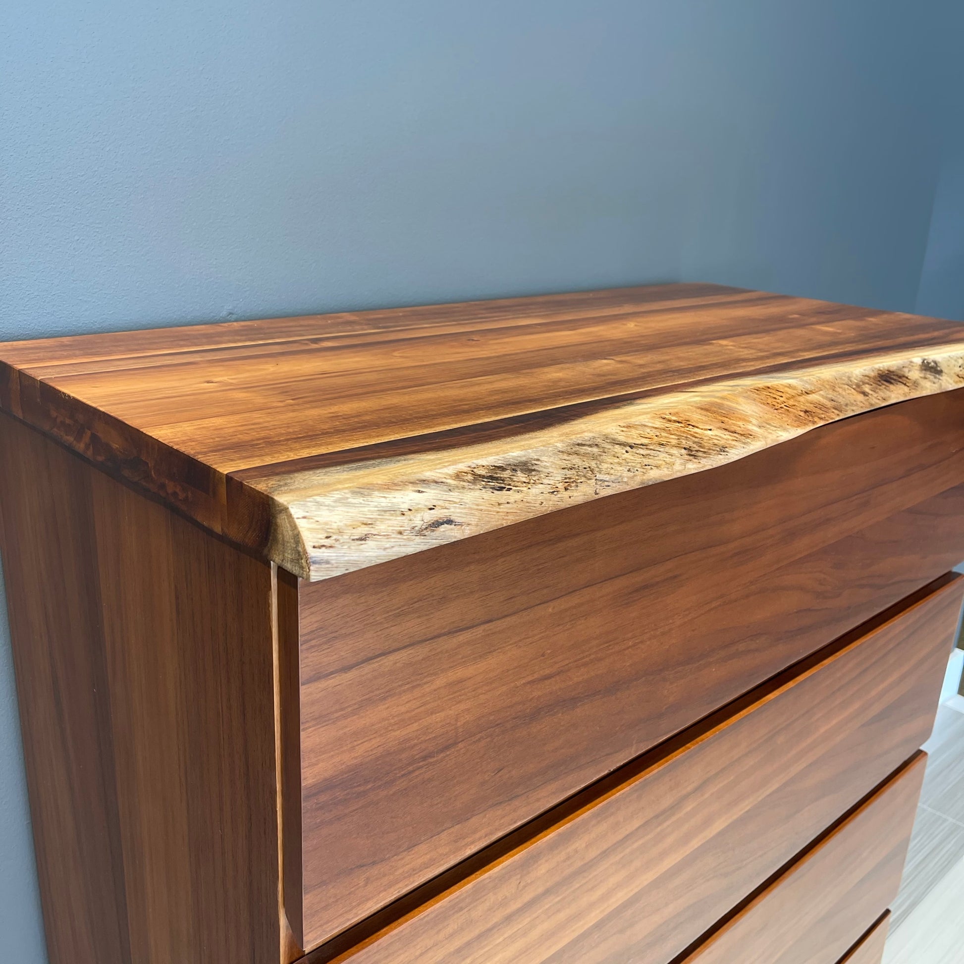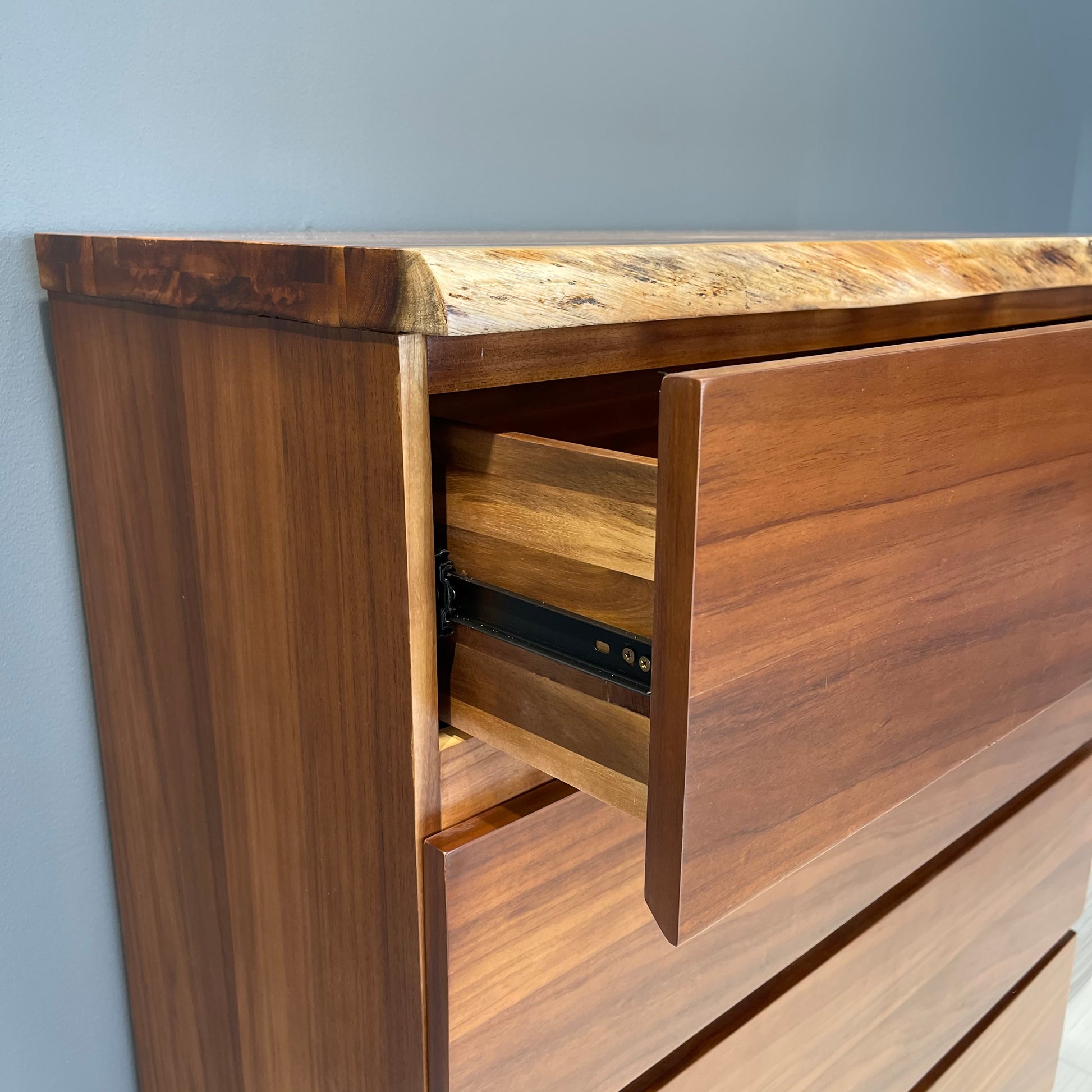 The Dark Valley Tallboy offers a stylish and practical storage solution for your bedroom, blending rustic charm with modern design. Expertly crafted from premium Blackwood timber, it showcases the natural grain patterns and unique feature edges, making each piece one of a kind. Supported by sleek black aluminium legs, this tallboy combines timeless craftsmanship with contemporary functionality.