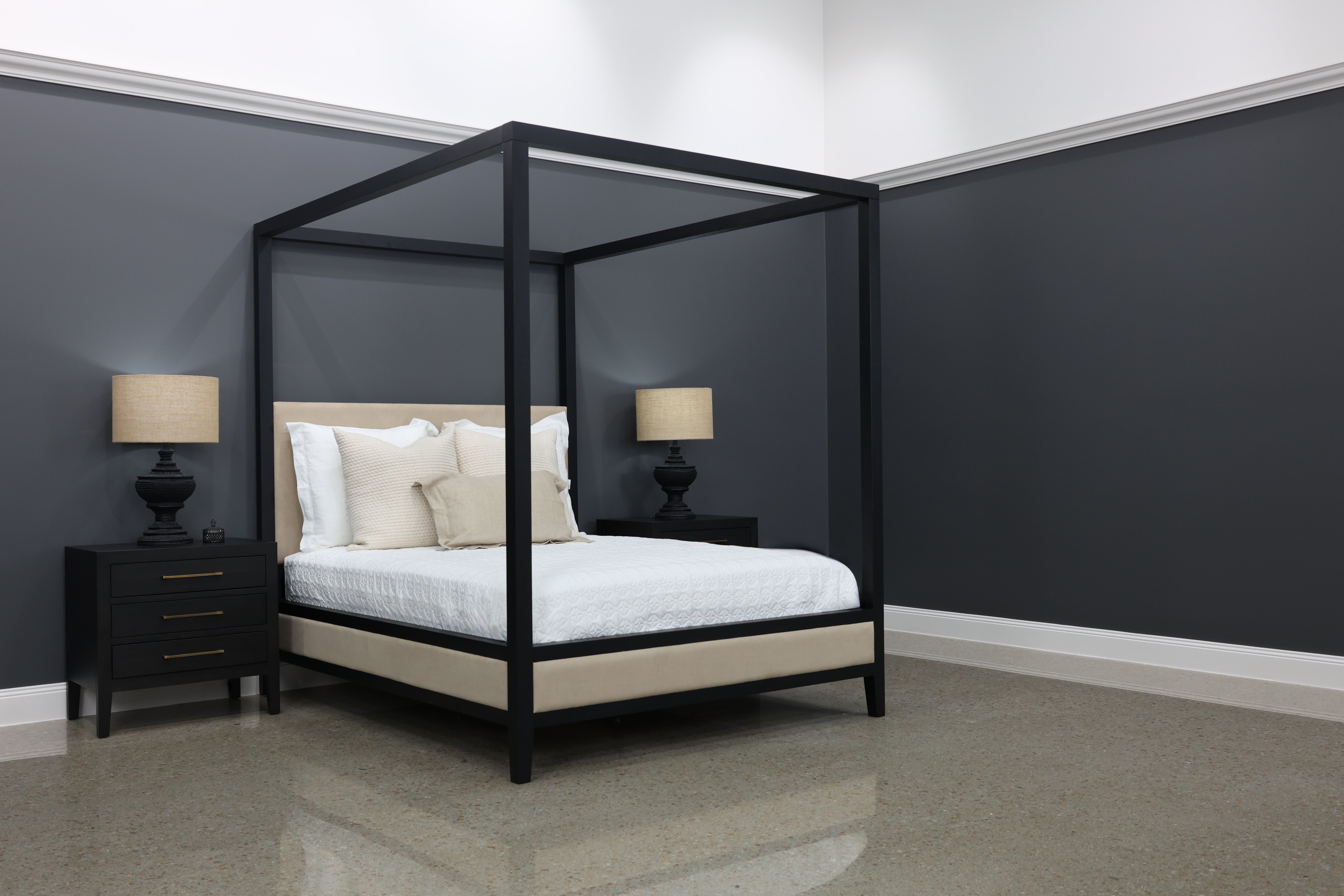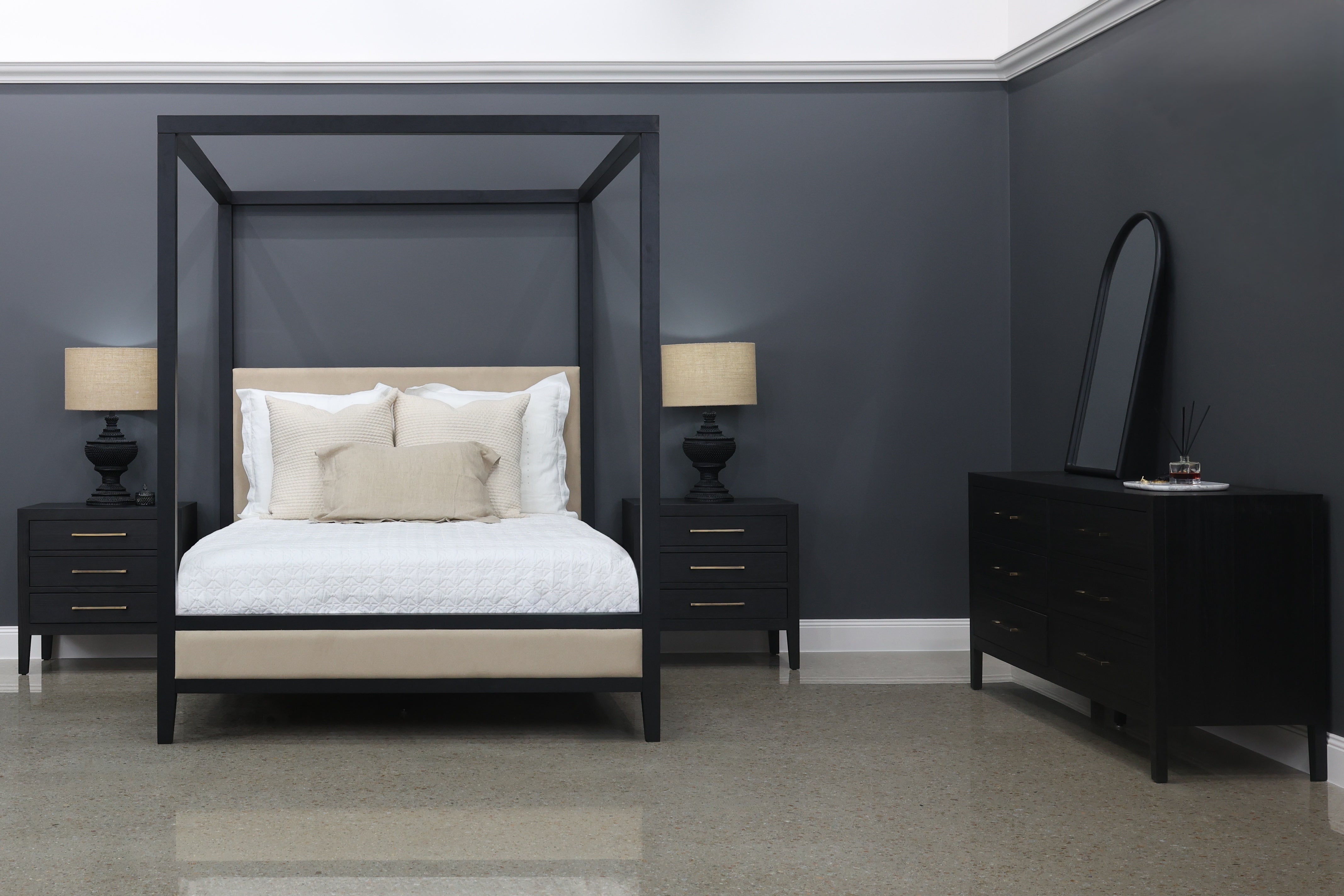 Introducing the Elizabeth Bed w/ Posts. With its bold four-poster frame, this bed makes a stunning statement while still feeling inviting and comfortable. The black timber finish adds depth and character, while the upholstered headboard and footboard bring a soft, cosy element that’s perfect for leaning back with a book or enjoying a slow morning. Stylish yet practical, the Elizabeth Bed is built to last and designed to be the centrepiece of your space.