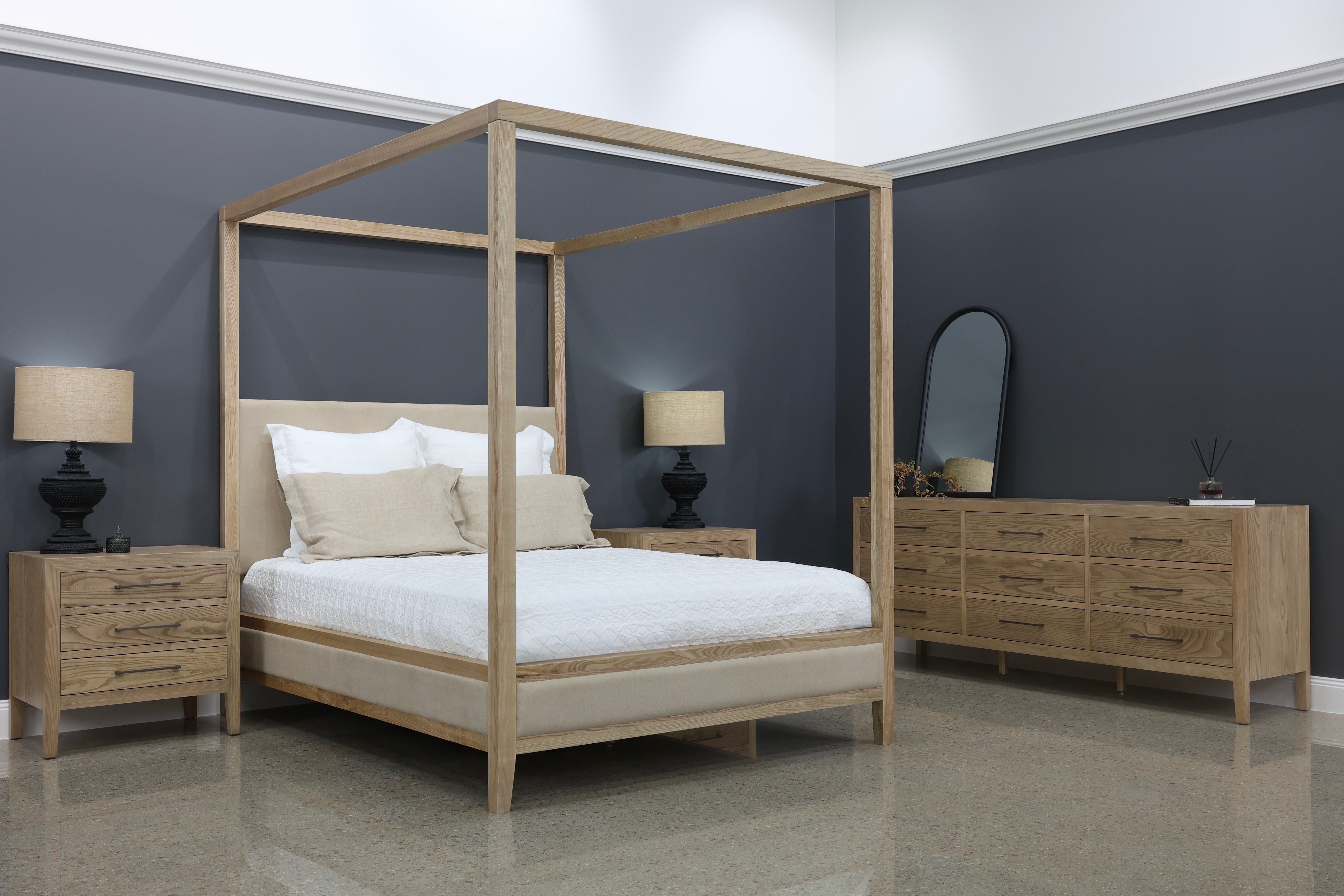 Introducing the Elizabeth Bed w/ Posts. With its bold four-poster frame, this bed makes a stunning statement while still feeling inviting and comfortable. The timber finish adds depth and character, while the upholstered headboard and footboard bring a soft, cosy element that’s perfect for leaning back with a book or enjoying a slow morning. Stylish yet practical, the Elizabeth Bed is built to last and designed to be the centrepiece of your space.