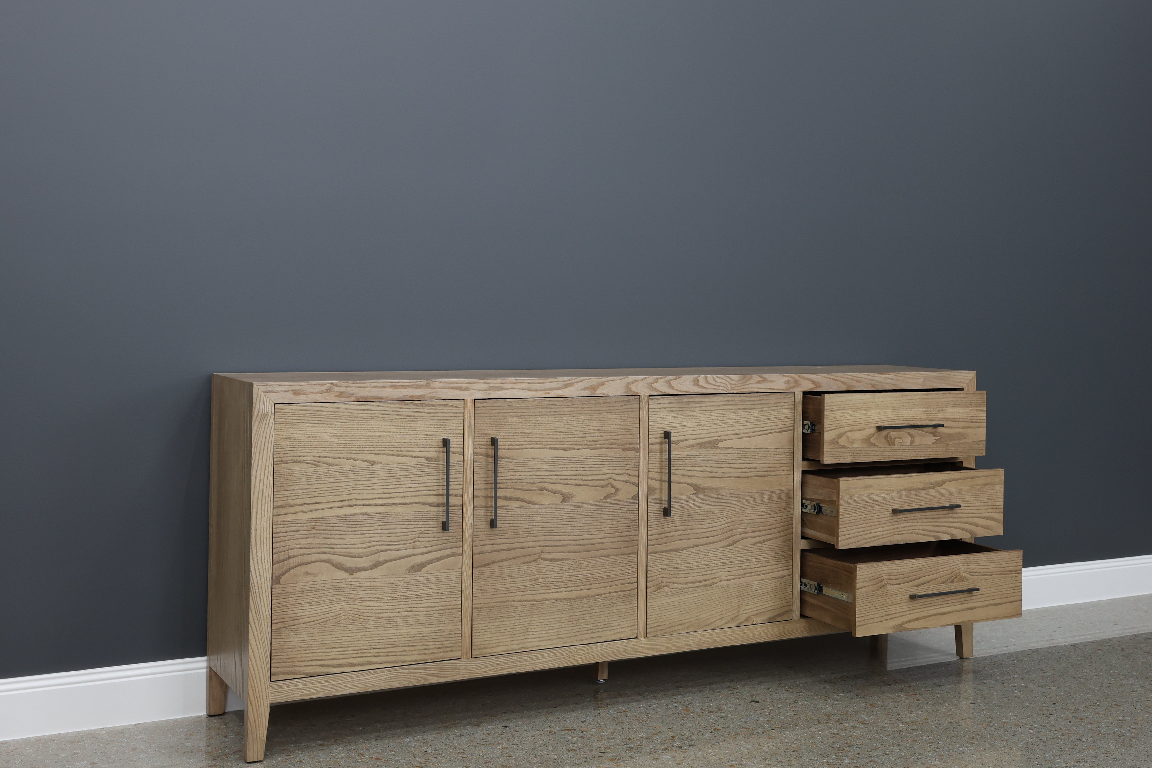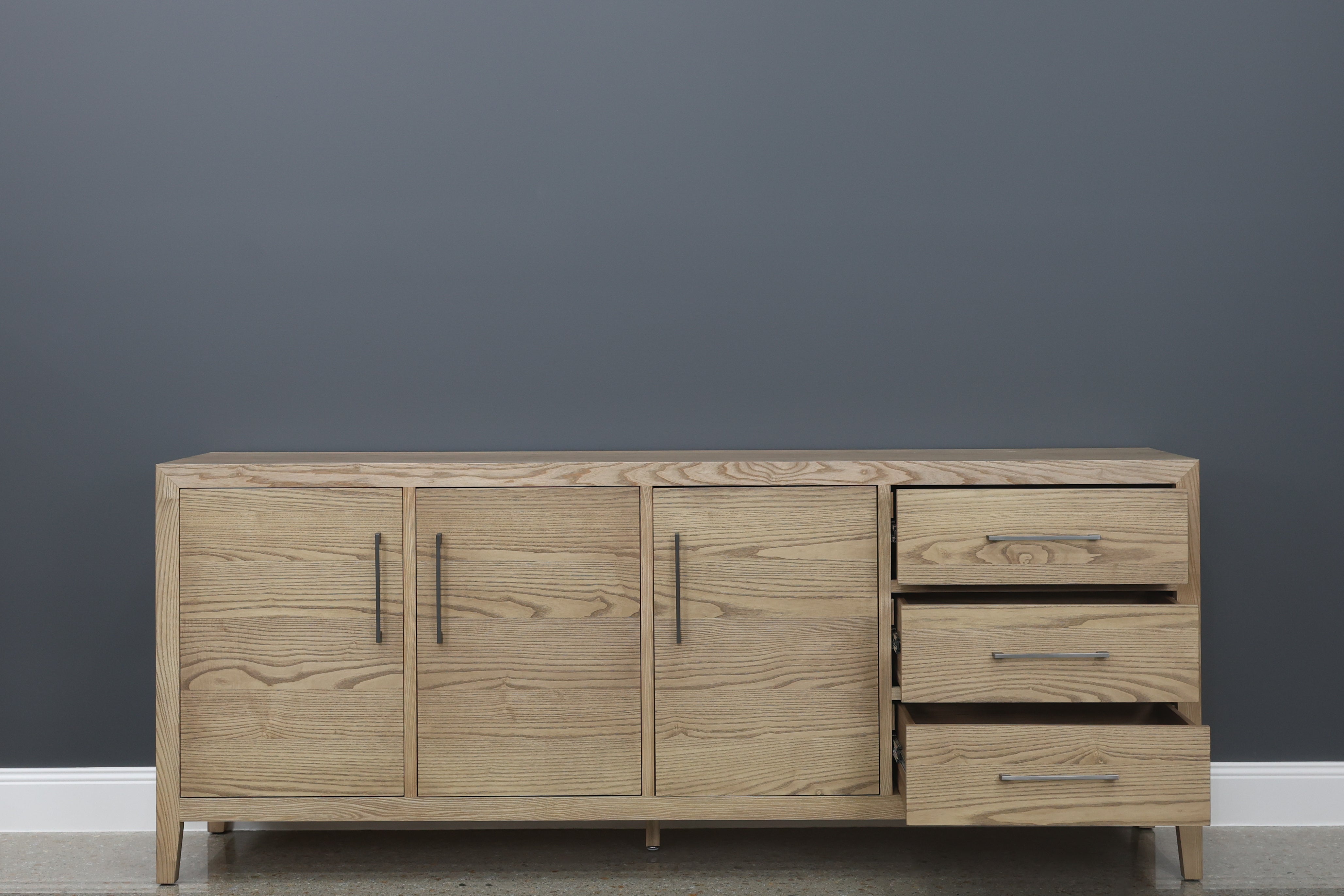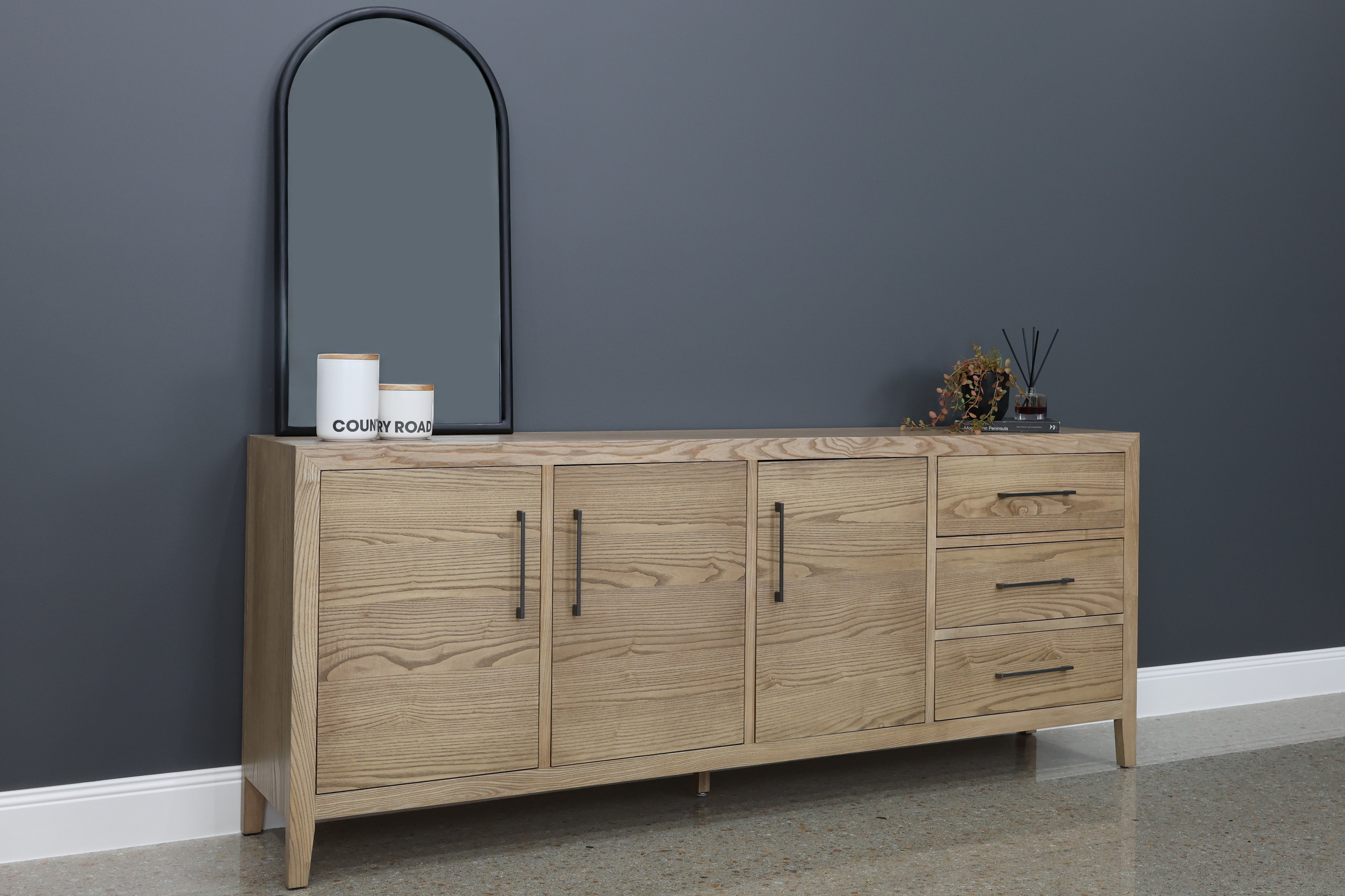 The Elizabeth Buffet is a sophisticated and functional storage solution, ideal for modern dining rooms and living spaces. Its sleek design, natural wood grain finish, and elegant detailing make it both a statement piece and a practical addition to any interior.