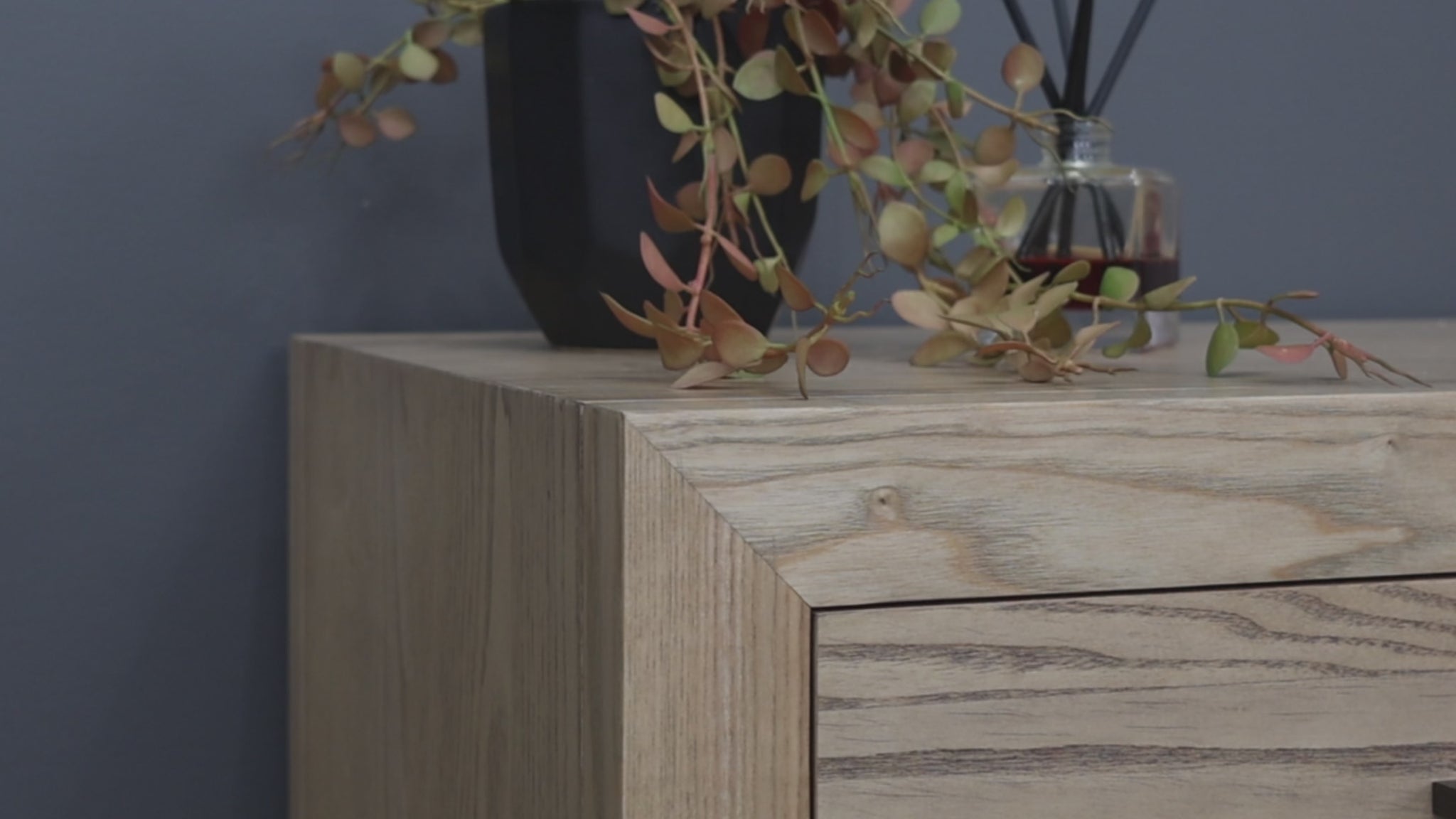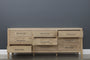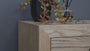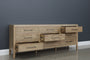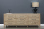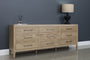 The Elizabeth Dresser features nine spacious drawers and a sleek natural wood grain finish. Its clean lines and tapered legs create a modern look with a hint of mid-century style. Each of the nine spacious drawers is adorned with a horizontally elongated handle in a dark metallic finish, perfectly aligning with the dresser's overall aesthetic.