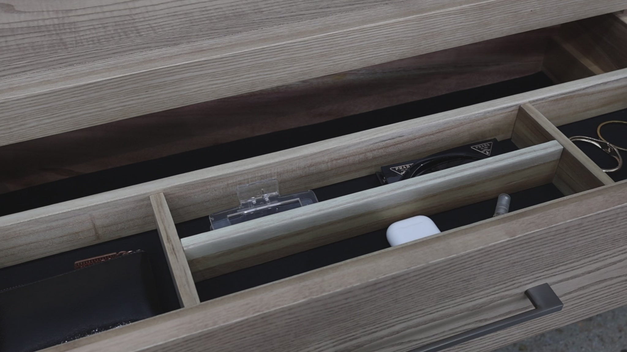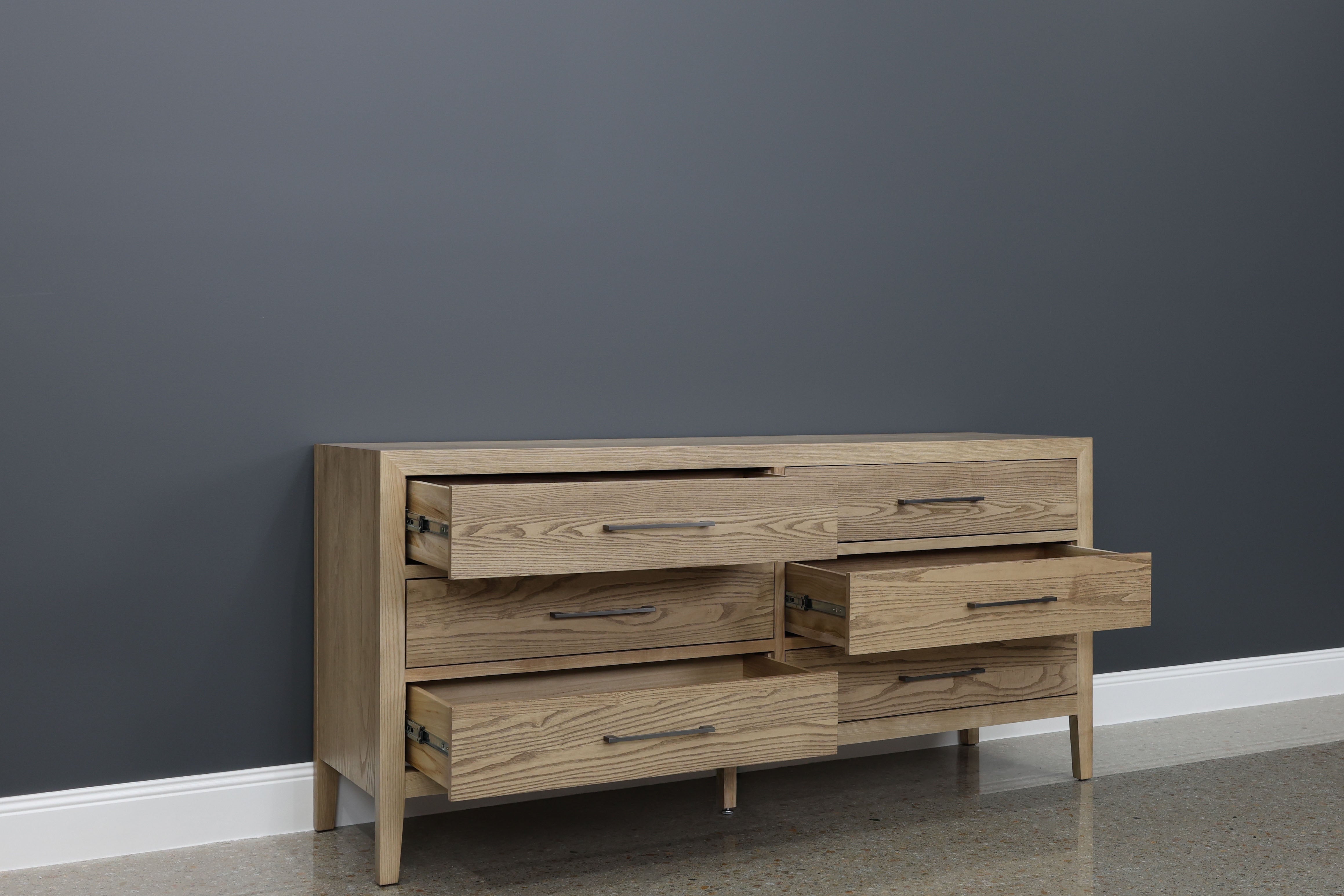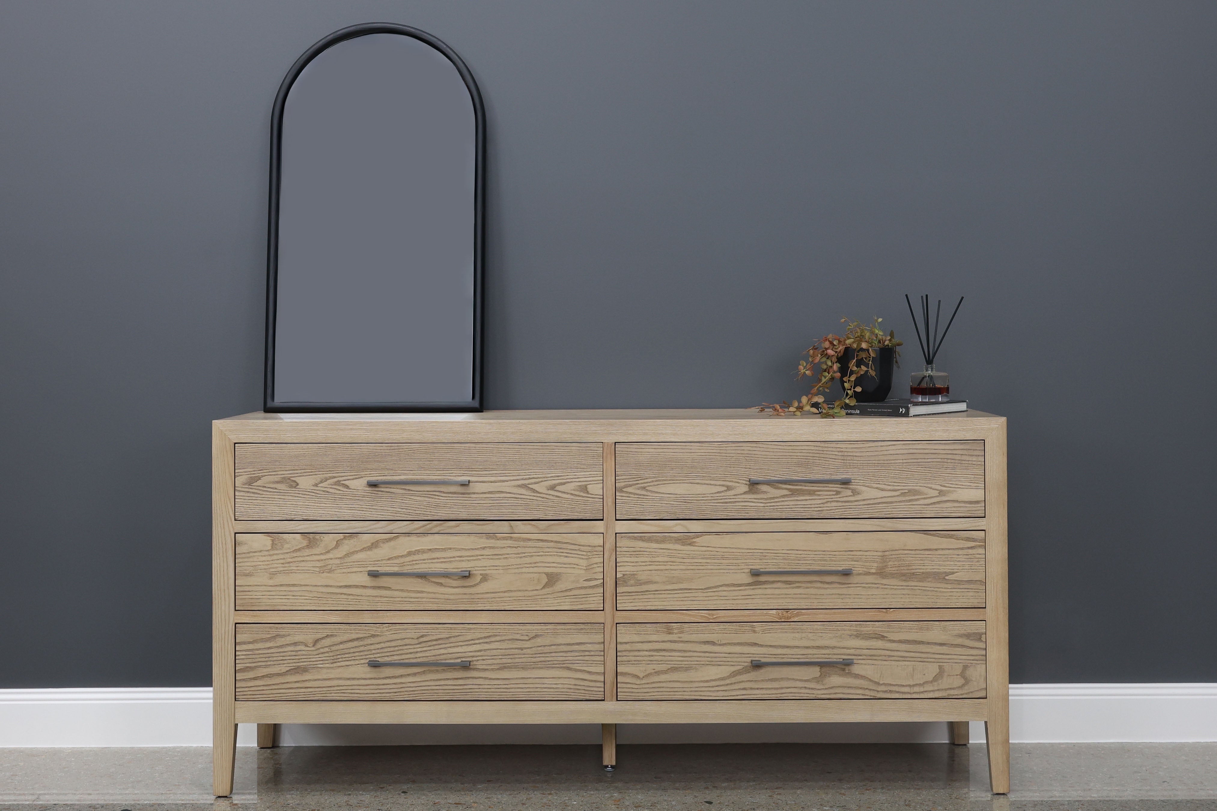 The Elizabeth Dresser with Jewellery Compartment features six drawers and removable jewellery compartment in each of the top two drawers. It boasts a sleek natural wood grain finish whilst the clean lines and tapered legs create help to create a modern look with a hint of mid-century style.