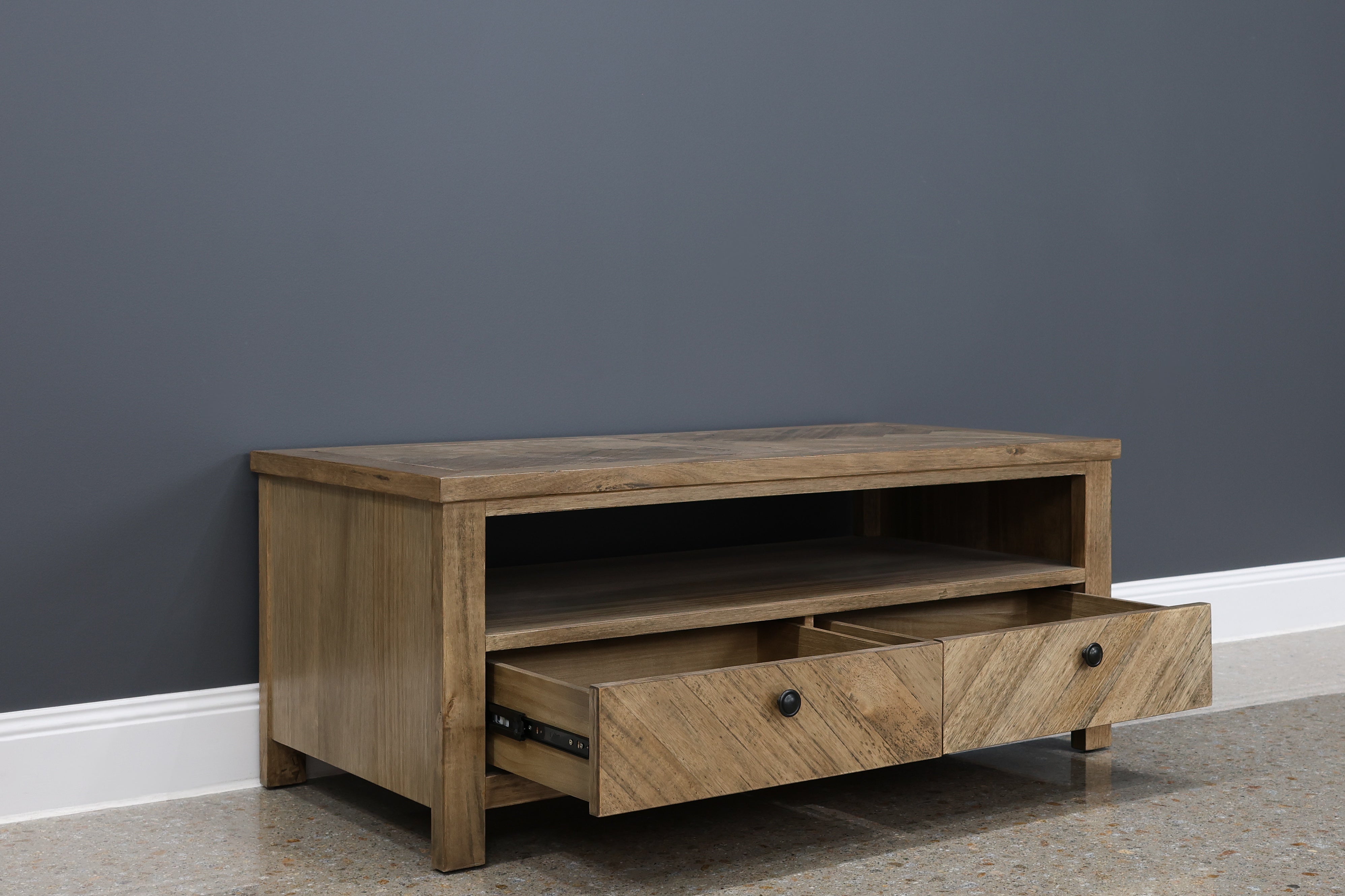 Complete your living space with the timeless appeal of the Flinders Coffee Table. Crafted from South American Eucalyptus, it offers the perfect balance of durability and natural warmth. The eye-catching herringbone design on the drawers lends an artisanal flair, while the open shelf and twin drawers provide practical storage for books, remotes, and everyday essentials. Designed to anchor your lounge with ease, this piece delivers both style and function in equal measure.