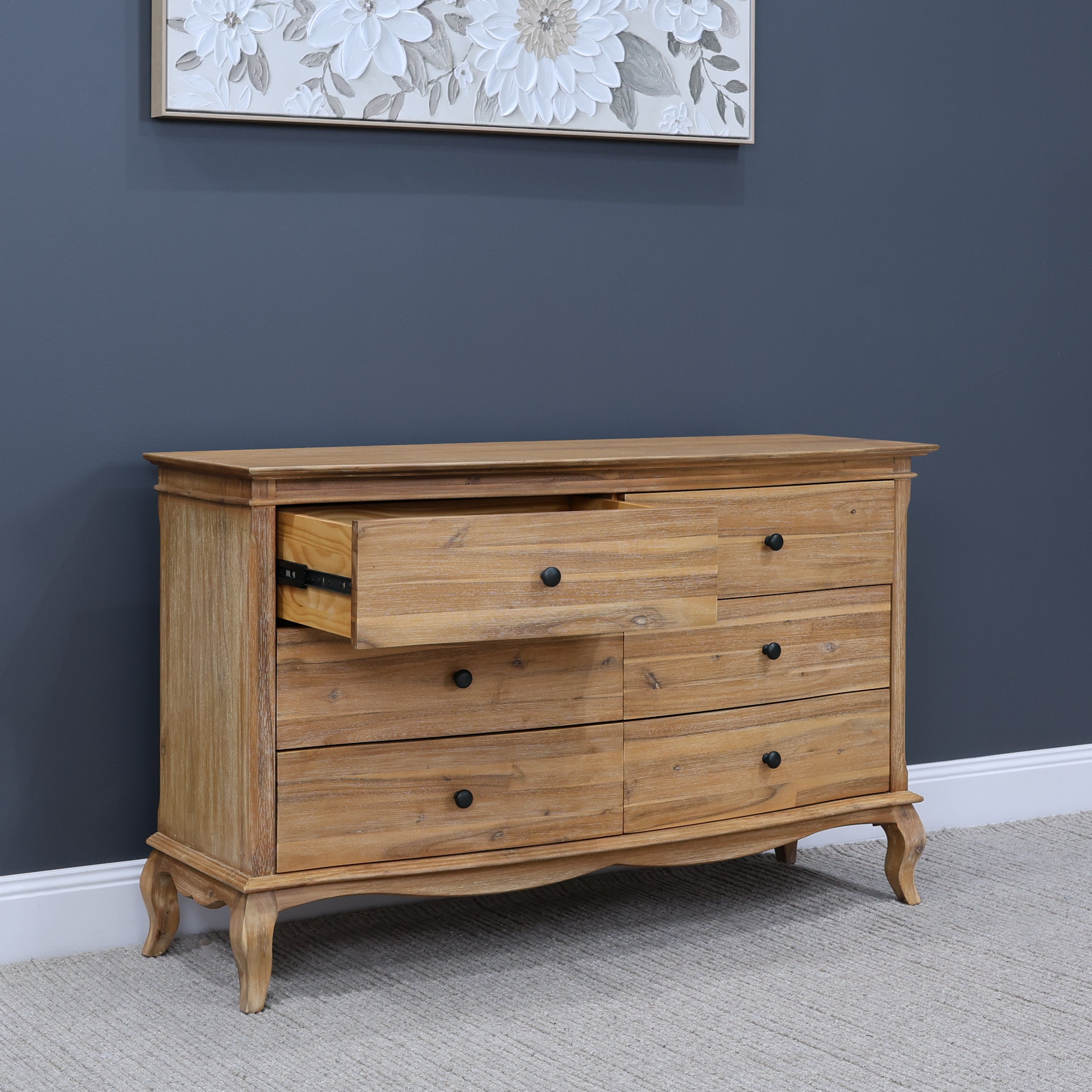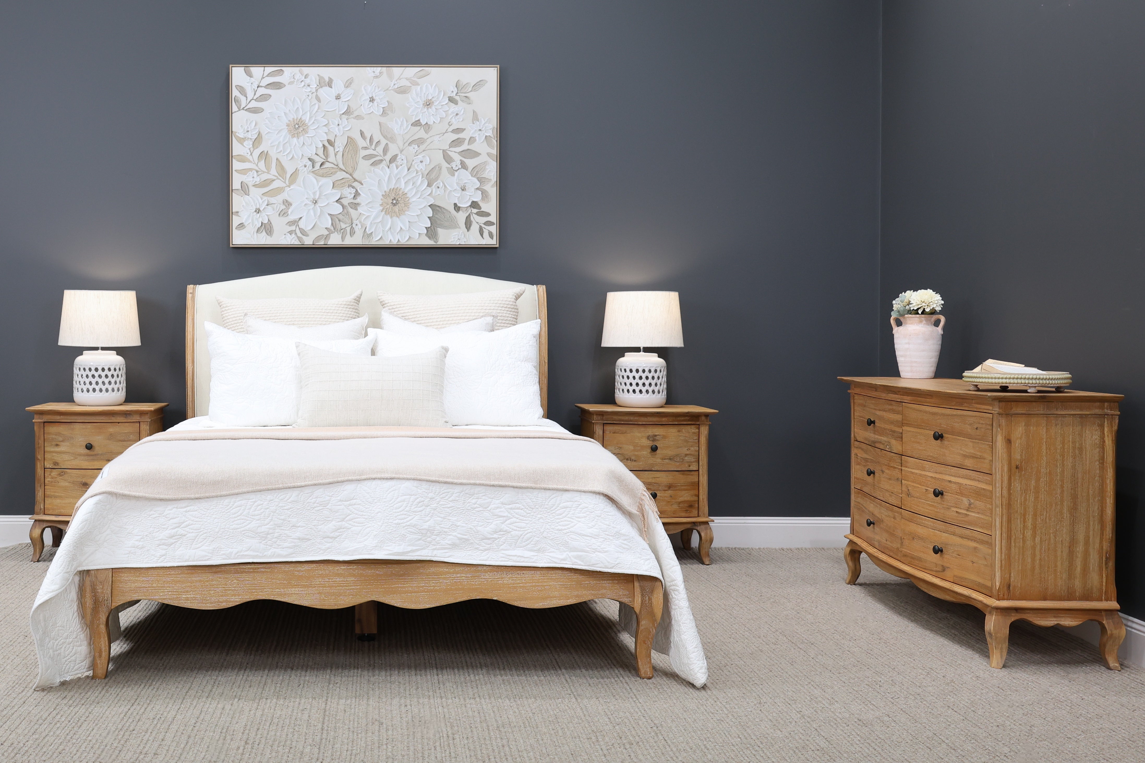 Introducing the French Provincial Collection. This French Provincial Dresser brings a sense of calm and classic beauty to your bedroom. With its gently distressed finish, elegant curves and soft minimal hardware, it feels like a piece that’s been lovingly passed down, yet built for modern living. Whether you're storing essentials or styling it with your favourite décor, this beautifully detailed and practical dresser does it all.