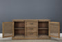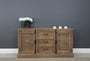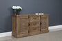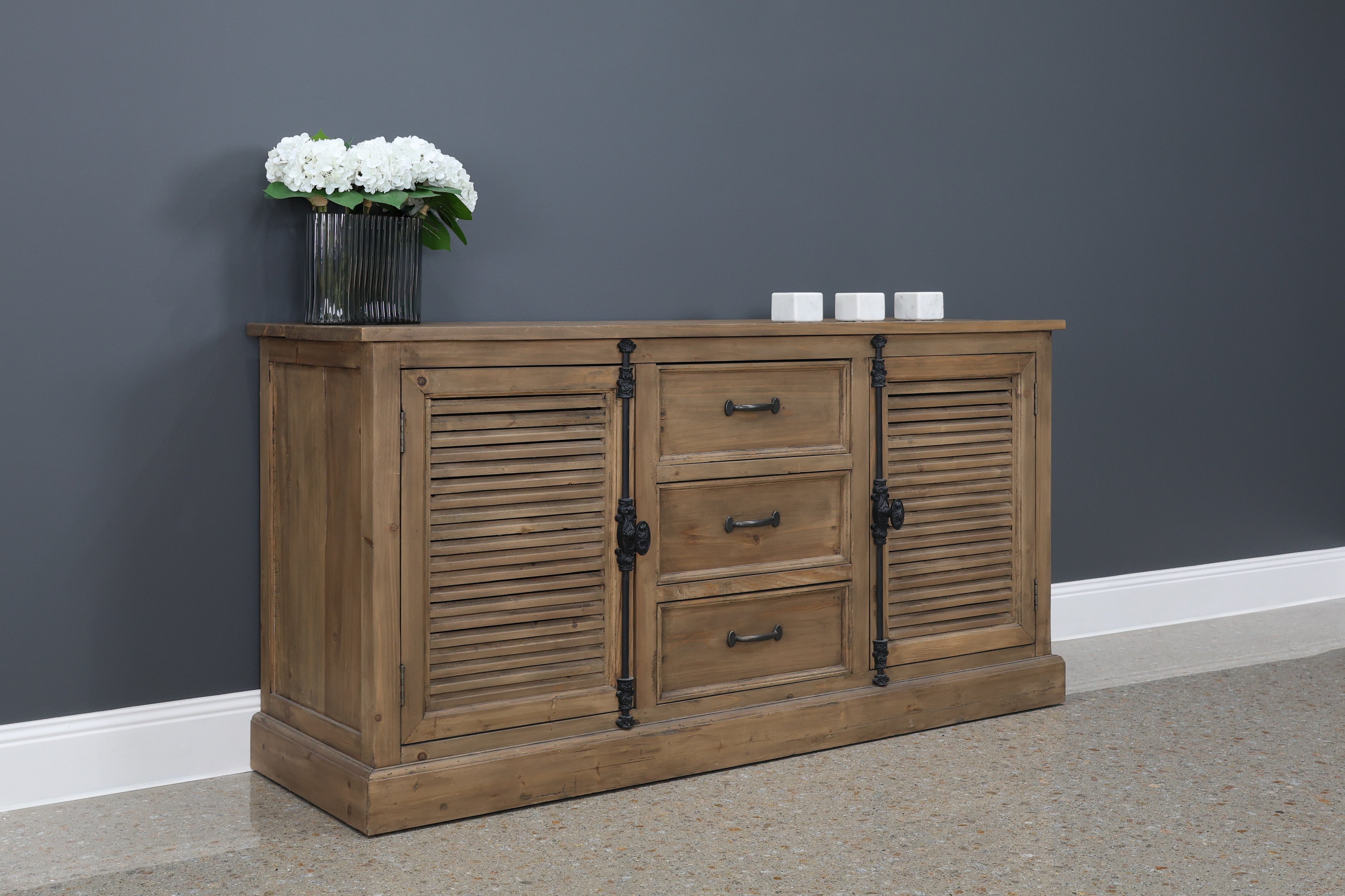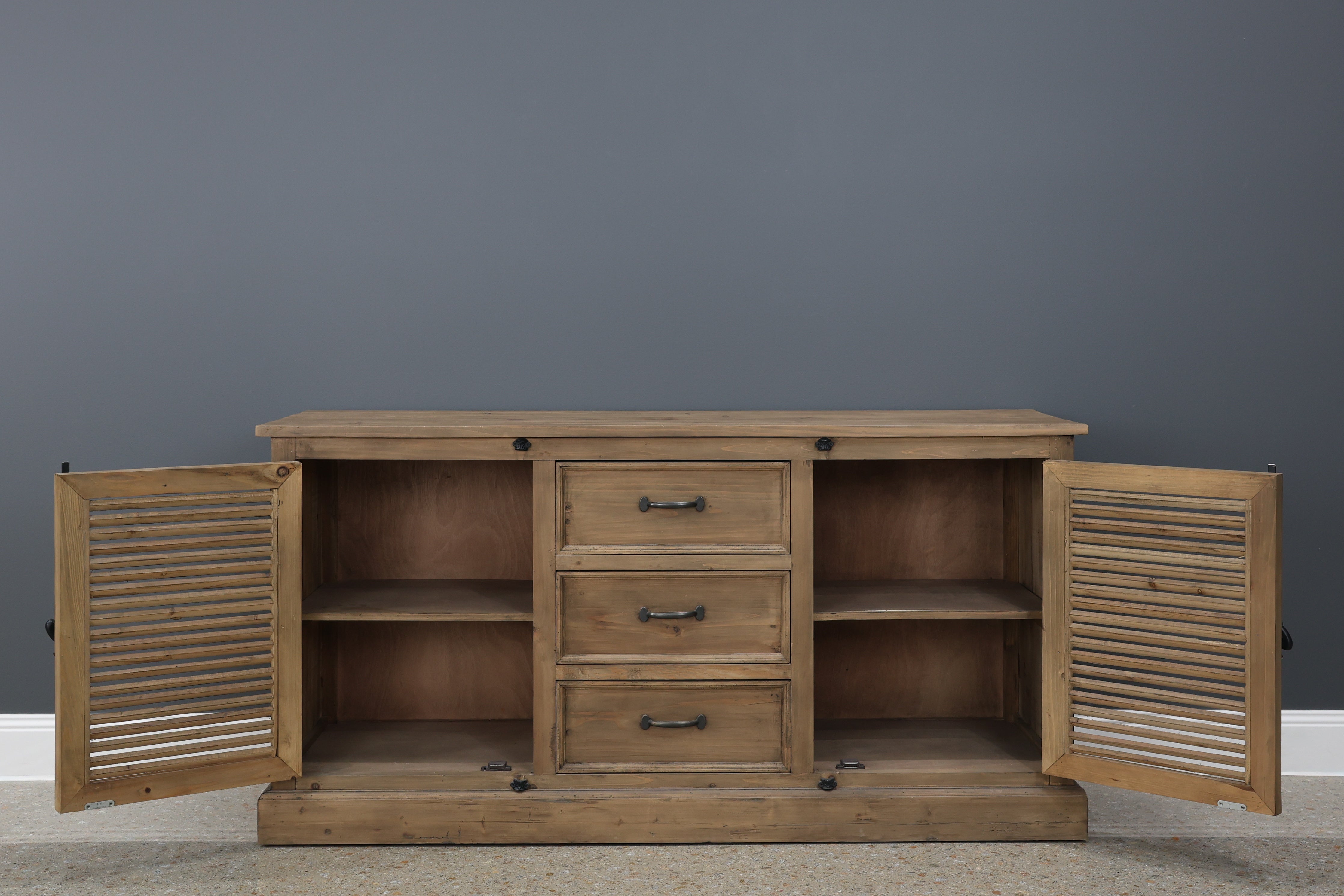 Elevate your living or dining space with the Hagrid Buffet, a statement piece that blends rustic charm with industrial design. Crafted from recycled materials, this buffet combines sustainability with character. It features three drawers with bronze handles and two cupboards with espagnolette bolt handles for a touch of vintage elegance. The cupboard doors boast vented-style panelling, adding texture and interest to the overall design.
