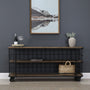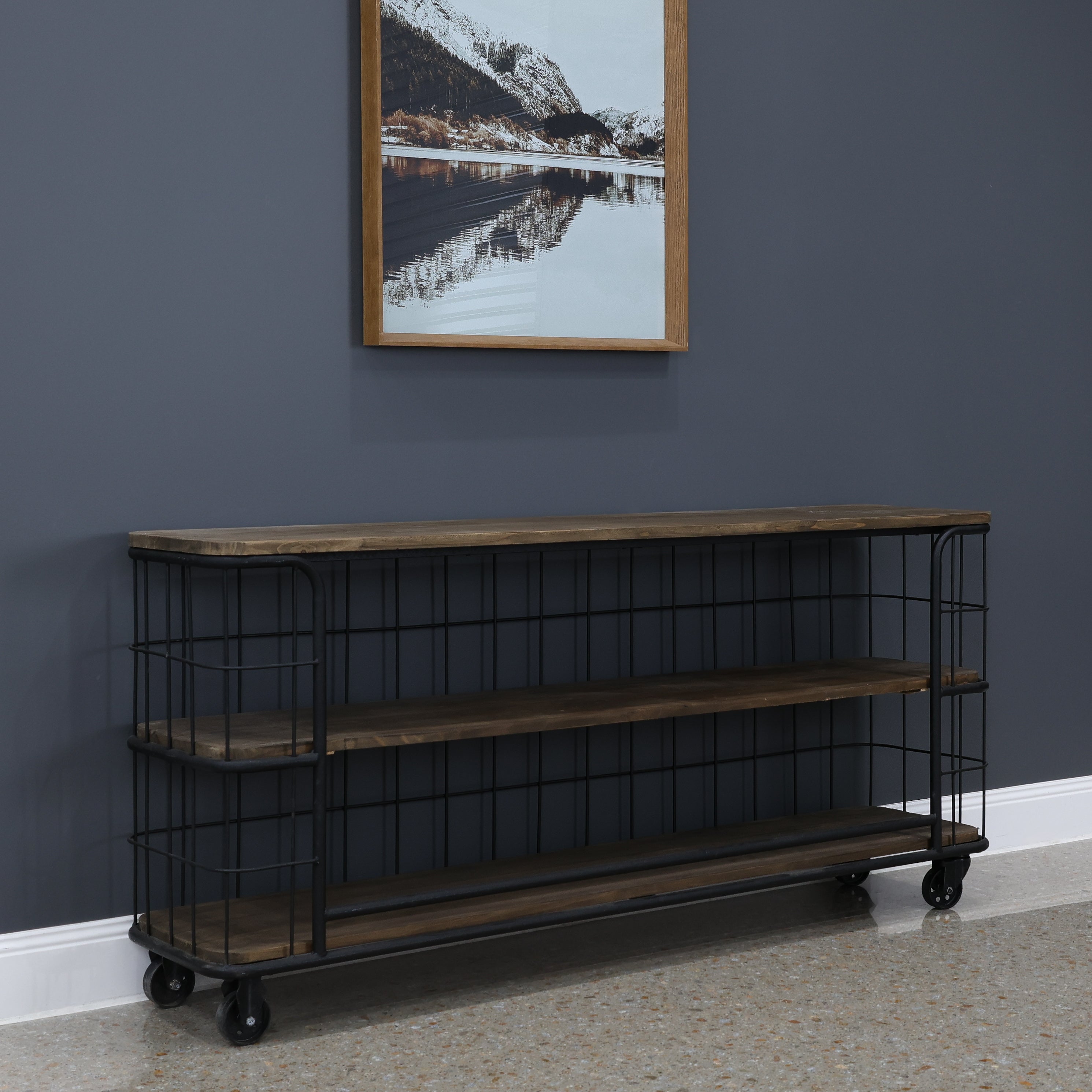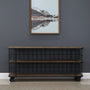 The Henty Open Sideboard blends industrial charm with sustainable design, crafted from recycled materials, including metal, timber, and hardware. Its unique character shines through natural imperfections such as warping, scratches, dents, cracks, splinters, and chips, adding authenticity and charm to the piece. The sideboard features a black metal curved cage frame, a timber shelf & top for ample storage, and wheels. Perfect for those who appreciate a rustic and raw aesthetic, this piece is a testament to eco-friendly craftsmanship.