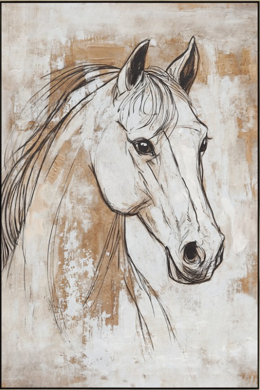 The Hugo Horse canvas captures the graceful strength and gentle spirit of a horse through expressive sketch-style line work and warm, earthy tones. Its textured background adds depth and artistry, making it a striking feature piece for rustic, contemporary, or nature-inspired interiors. Perfect for adding character and a touch of untamed elegance to any room.