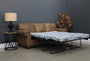 Enhance your living space with the rustic charm of weathered leather. The Laura faux leather three-seater sofa bed envelops you in comfort with its beautifully soft feel and provides lasting durability. Embrace the blend of a supportive yet firm seat, a plush backrest and bold jumbo window-pane stitching. Infused with classic features like rolled arms and turned feet, it effortlessly introduces a dash of timeless tradition whilst still offering that worn farmhouse feel. The inclusion of a pull-out Queen Size mattress with easy-glide functionality adds a touch of modern convenience.