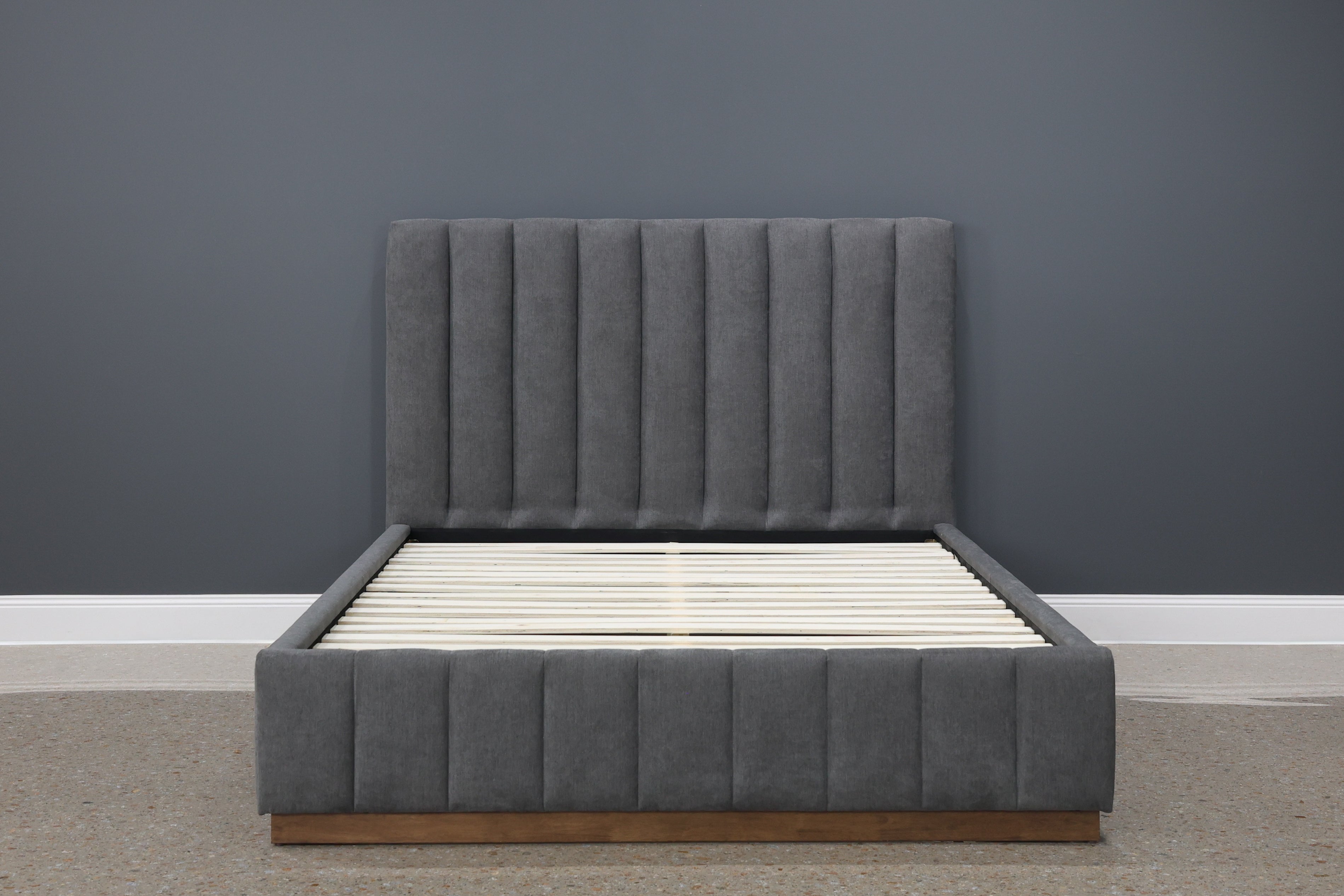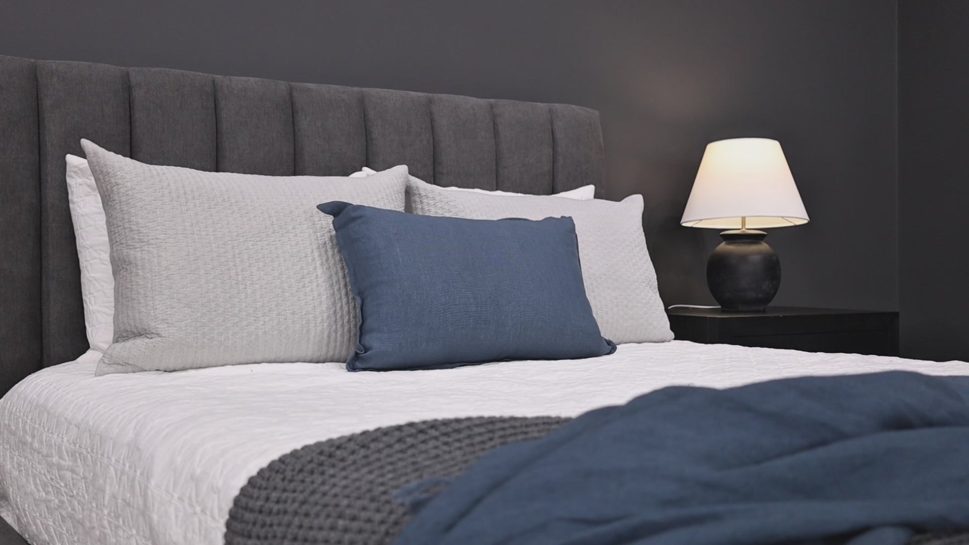 The Melbourne Upholstered Bed in Dark Grey combines contemporary elegance with comfort, making it a perfect centrepiece for modern bedrooms. Its sleek, minimalist design features a tall, vertically channelled headboard that adds texture and visual interest. Upholstered in a soft, neutral fabric, the bed exudes a warm and inviting aesthetic that complements a wide range of interior styles.