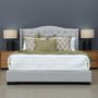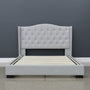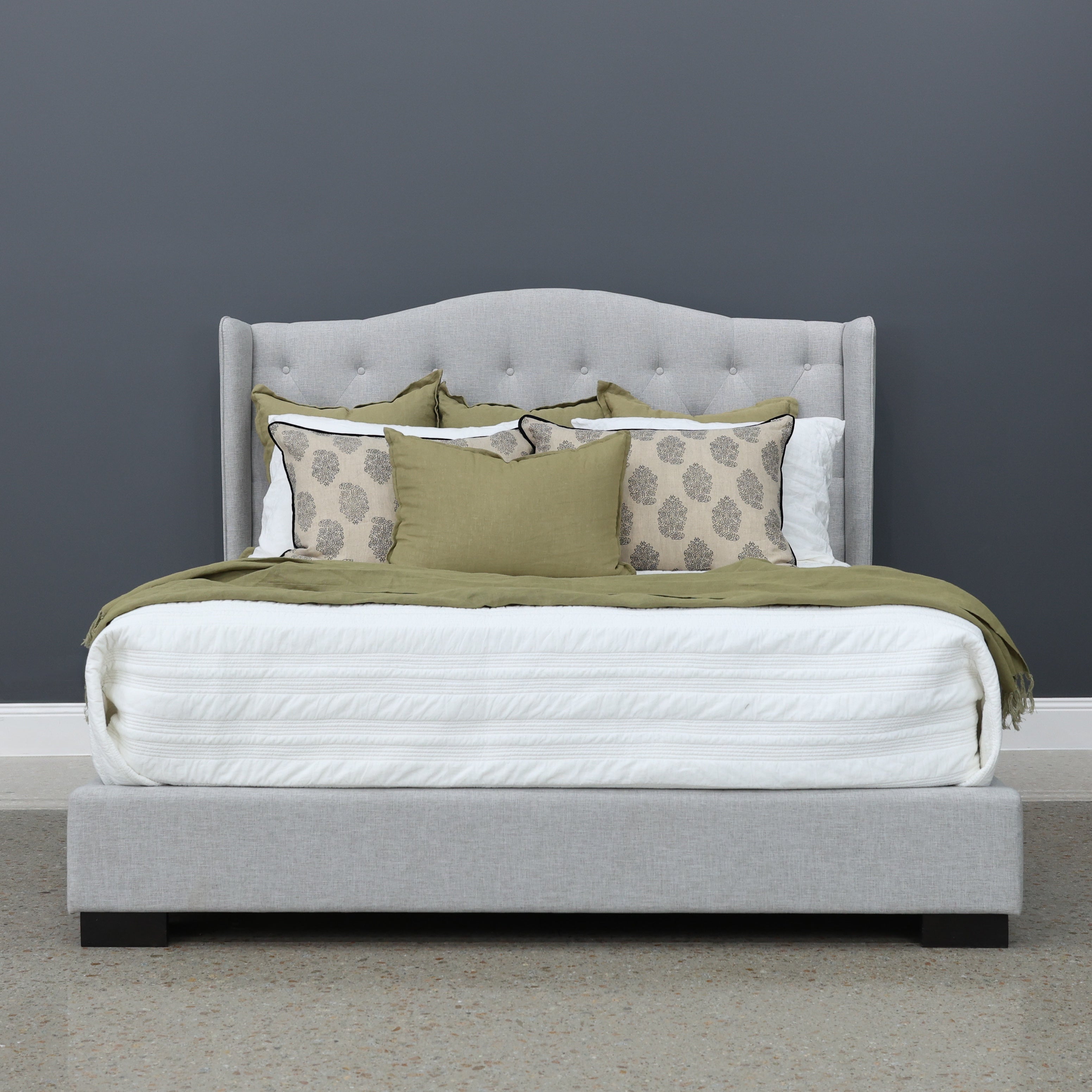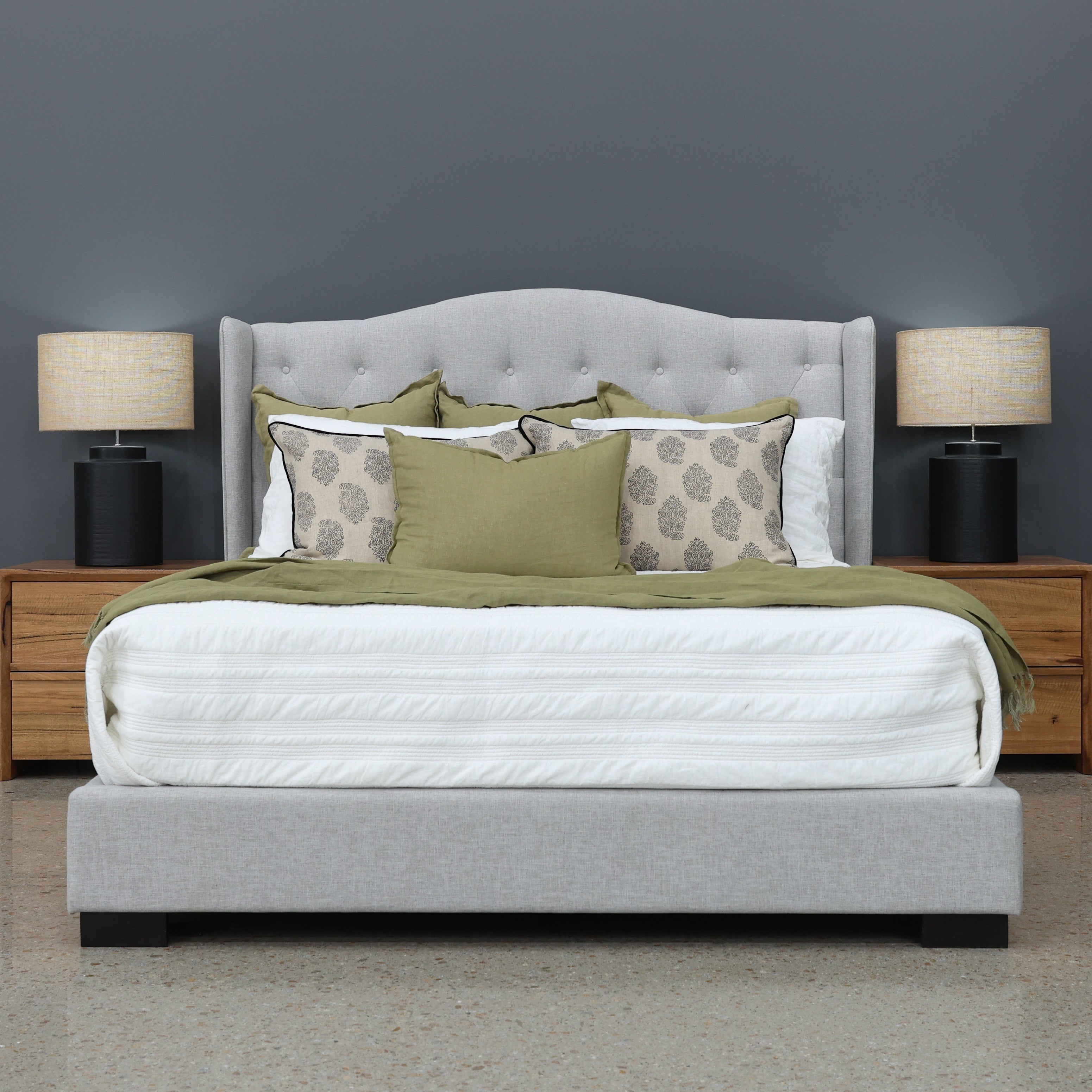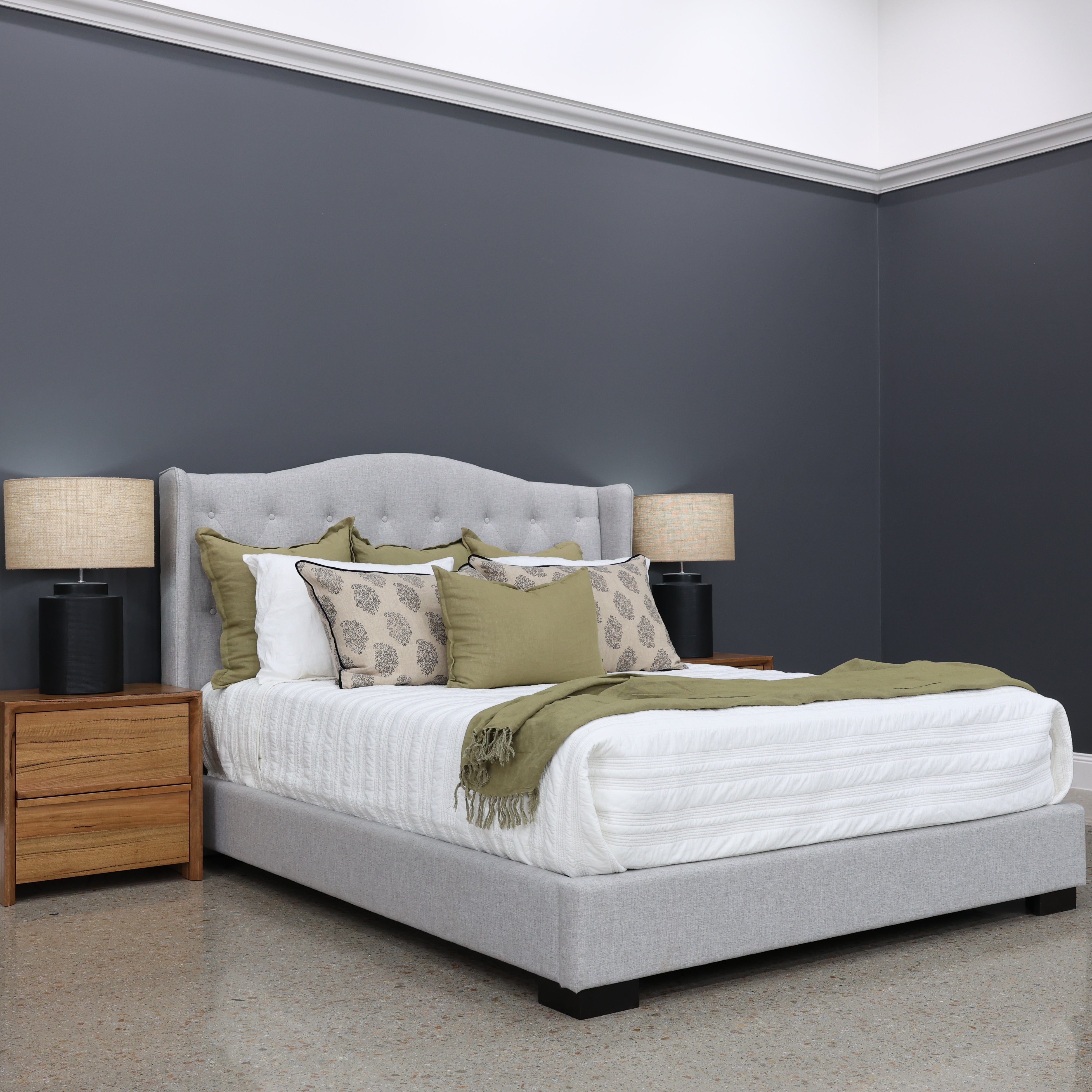 Introducing the Memphis Soft Grey Upholstered Bed Frame, showcasing a unique winged headboard design that effortlessly blends sophistication and practicality. The tufted headboard exudes timeless elegance, while solid timber slats and an extra centre rail ensure optimal support and stability. Elevate your sleep space with the Memphis bed frame, embracing comfort, style, and convenience in a single elegant package.