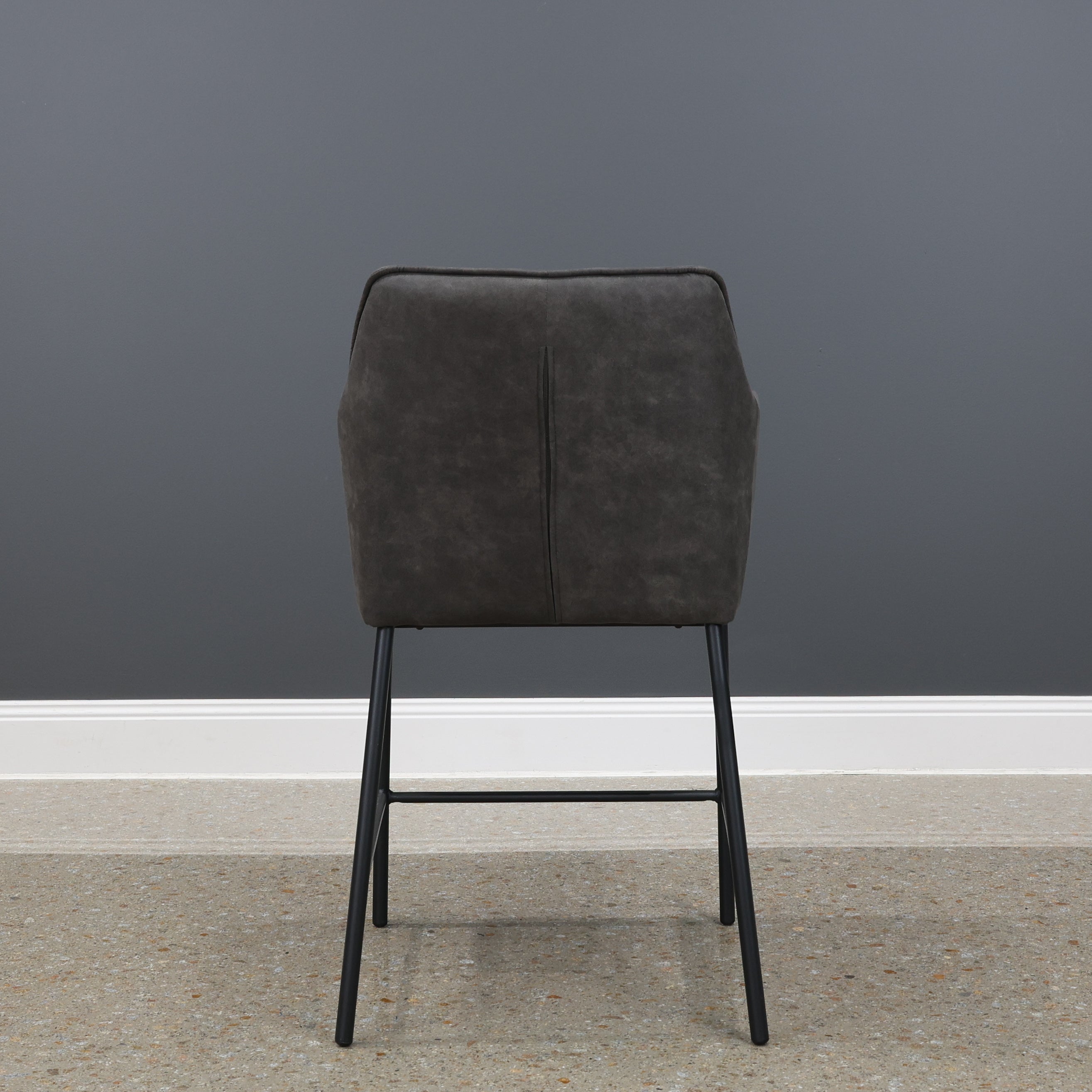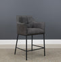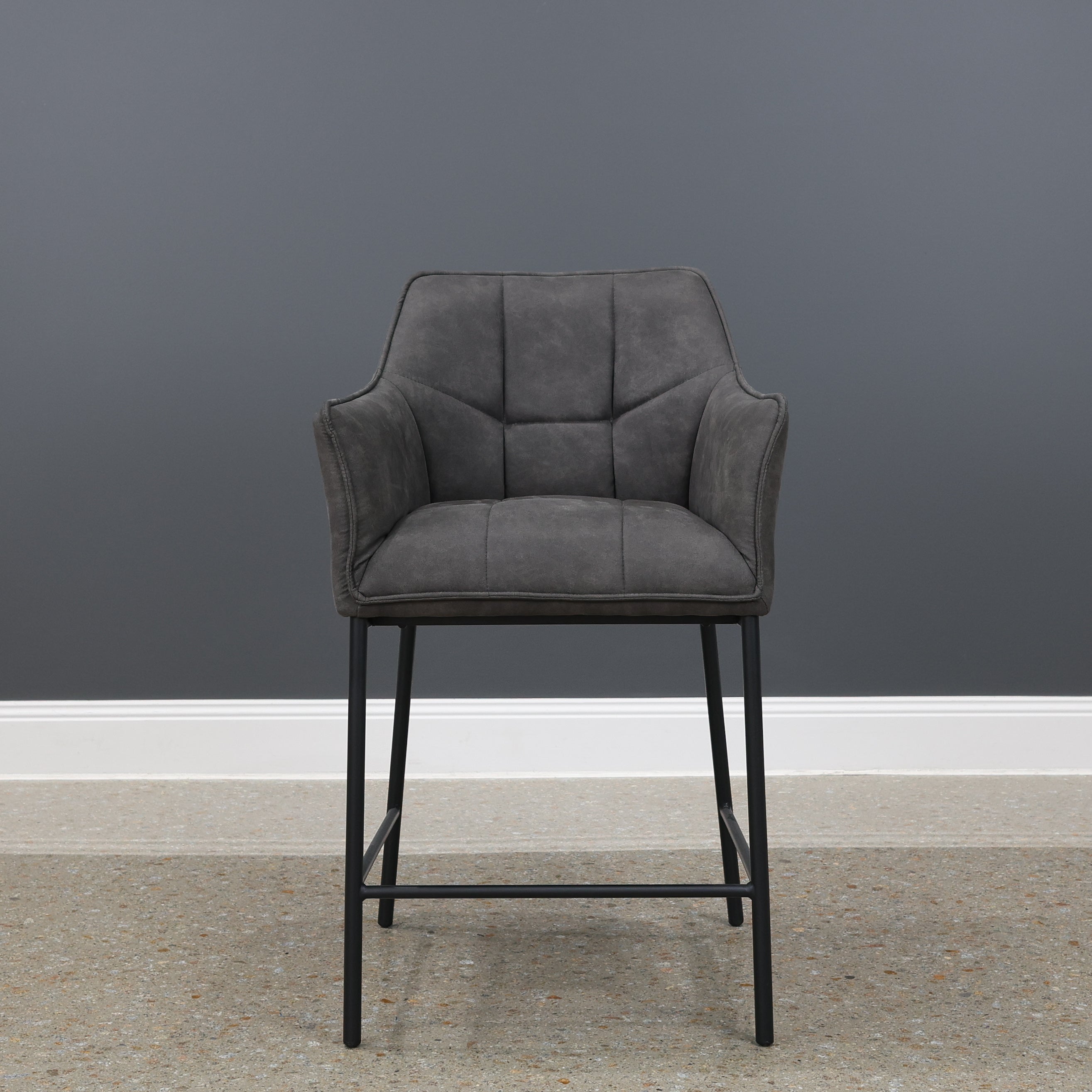 The Merricks Bar Stool in Grey seamlessly blends exceptional design with enduring comfort. Its stylishly stitched seat and backrest, complete with a featured zip, create a distinctive industrial look that enhances both style and durability. The dark grey fabric is crafted to mimic the appearance and longevity of leather, while providing the soft comfort of fabric. With a comfortable cushioned seat, backrest, and armrests, complemented by sleek black metal legs, the Merricks Bar Stool is a perfect addition to any modern space.