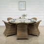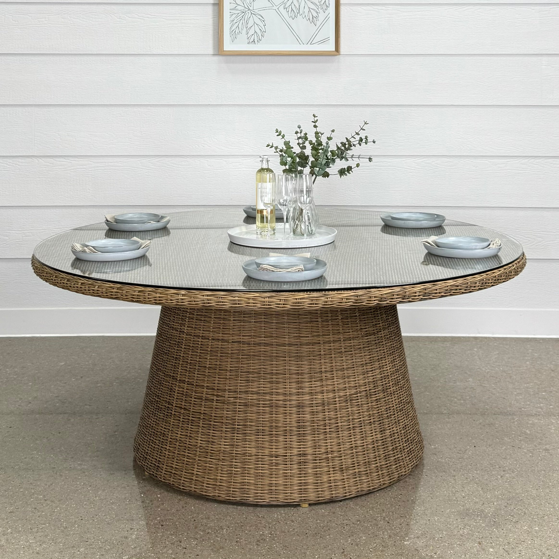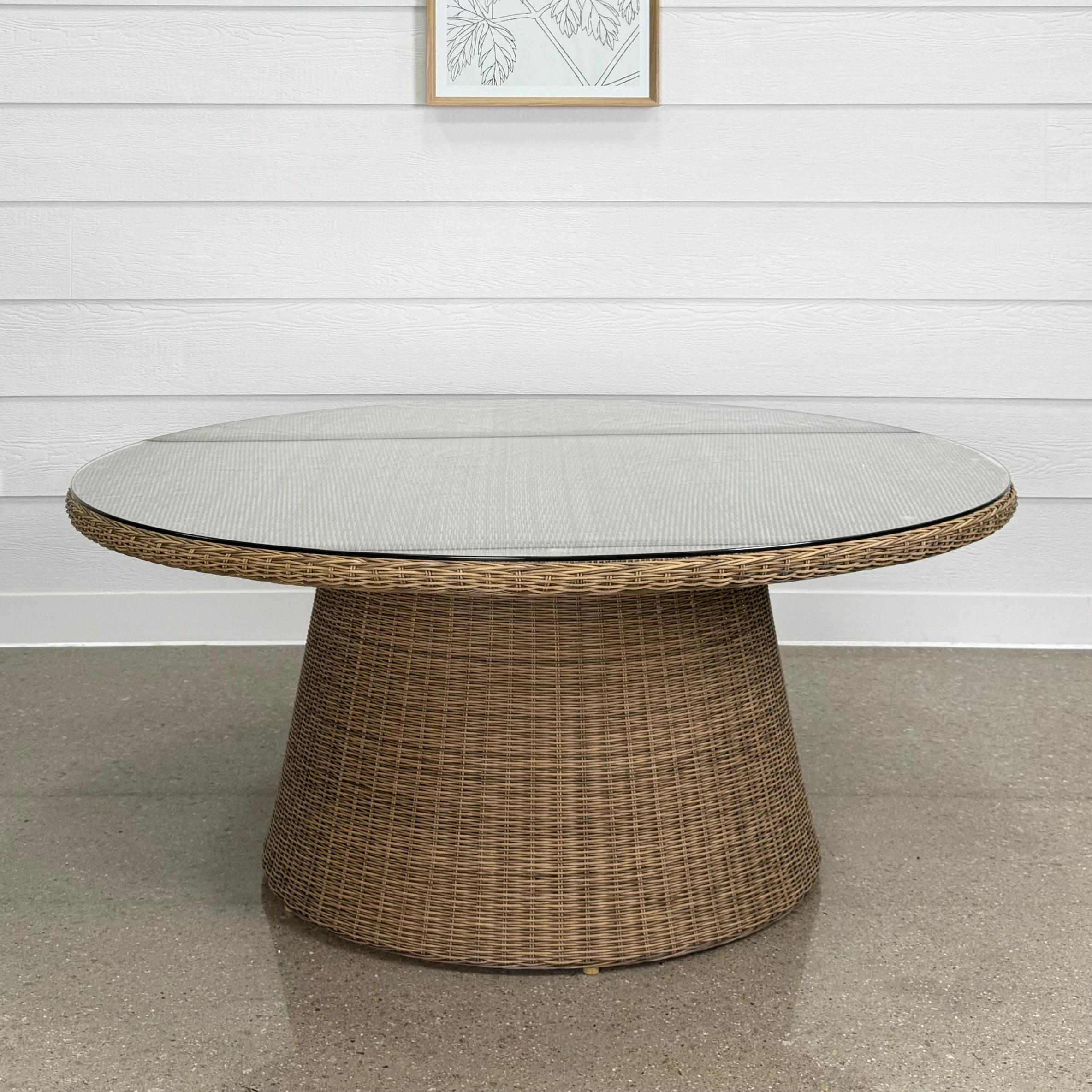 The Mulwala Dining Table exudes timeless elegance with its classic Hampton's design, effortlessly blending with a range of outdoor styles. Its sturdy frame is crafted from full round PE wicker, offering both aesthetic charm and practical durability, with resistance to UV rays, water, and rust. The table is topped with a sleek glass surface, adding a touch of refinement and enhancing its sophisticated look. Perfect for any outdoor setting, the Mulwala Dining Table combines style, durability, and functionality in one stunning piece.