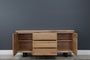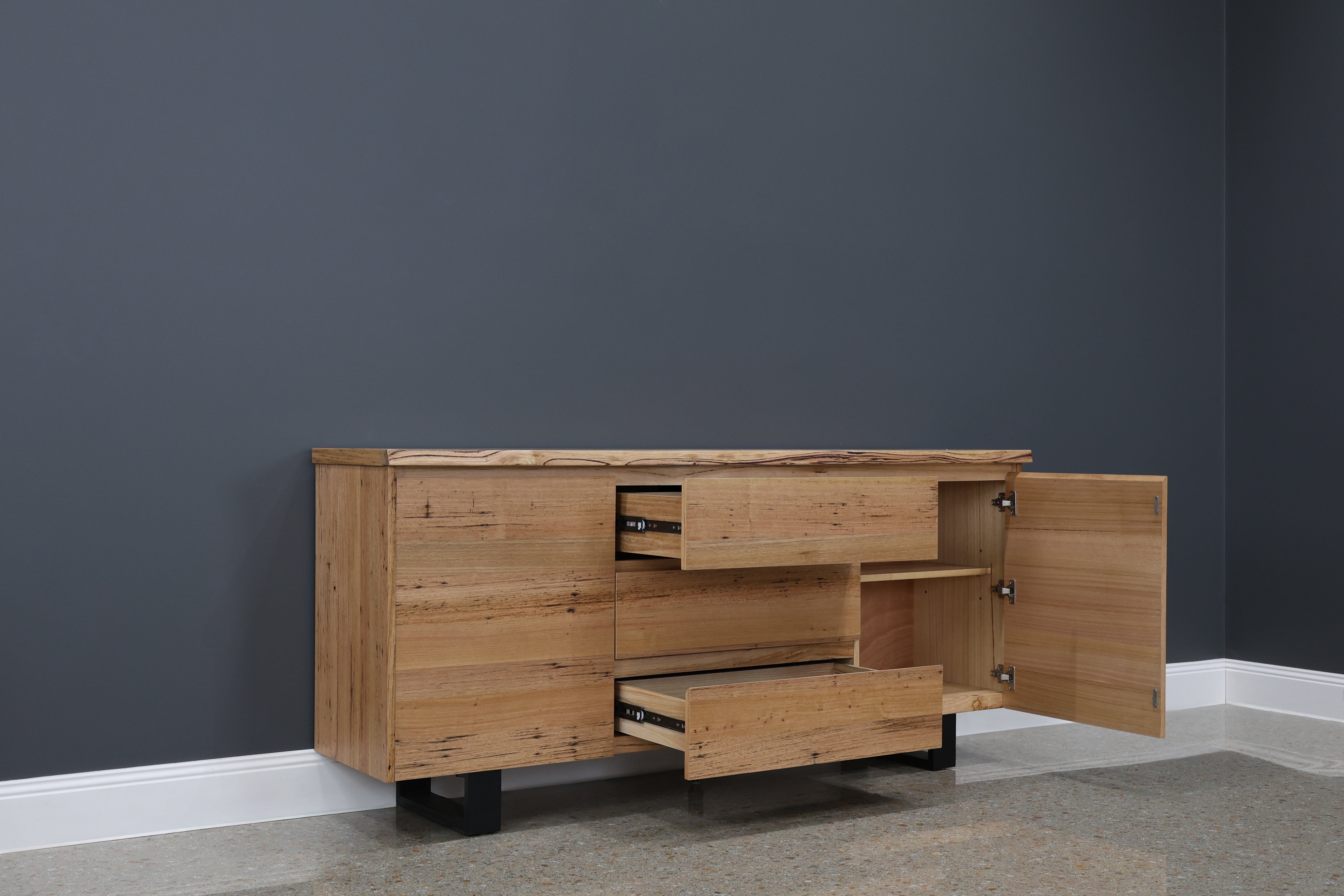 The Peninsula Buffet 180cm L is a refined storage unit that combines rustic charm with modern design, perfect for enhancing dining rooms or living spaces. Crafted from solid Wormy Chestnut timber veneer, it highlights the unique natural grain and earthy tones of the wood. This spacious buffet features three large cupboards and three deep drawers, providing versatile storage for dinnerware, cutlery, or household items. Supported by sturdy black metal legs, it offers stability while adding a subtle industrial edge. Its clean-lined rectangular design ensures timeless appeal, making it a statement piece for any contemporary or rustic interior.