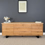 The Peninsula Buffet 220cm L is a refined storage unit that combines rustic charm with modern design, perfect for enhancing dining rooms or living spaces. Crafted from solid Wormy Chestnut timber veneer, it highlights the unique natural grain and earthy tones of the wood. This spacious buffet features three large cupboards and three deep drawers, providing versatile storage for dinnerware, cutlery, or household items. Supported by sturdy black metal legs, it offers stability while adding a subtle industrial edge. Its clean-lined rectangular design ensures timeless appeal, making it a statement piece for any contemporary or rustic interior.