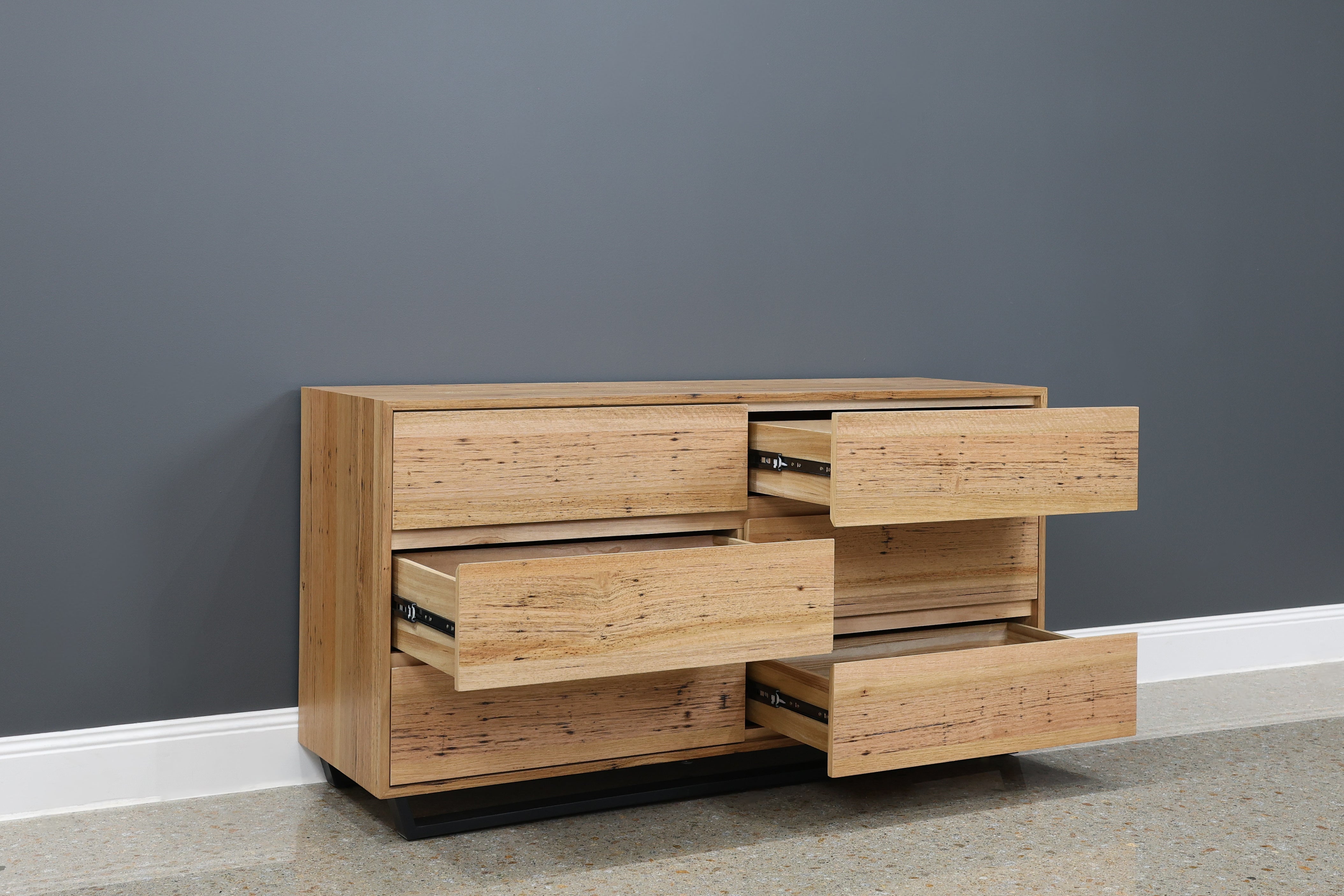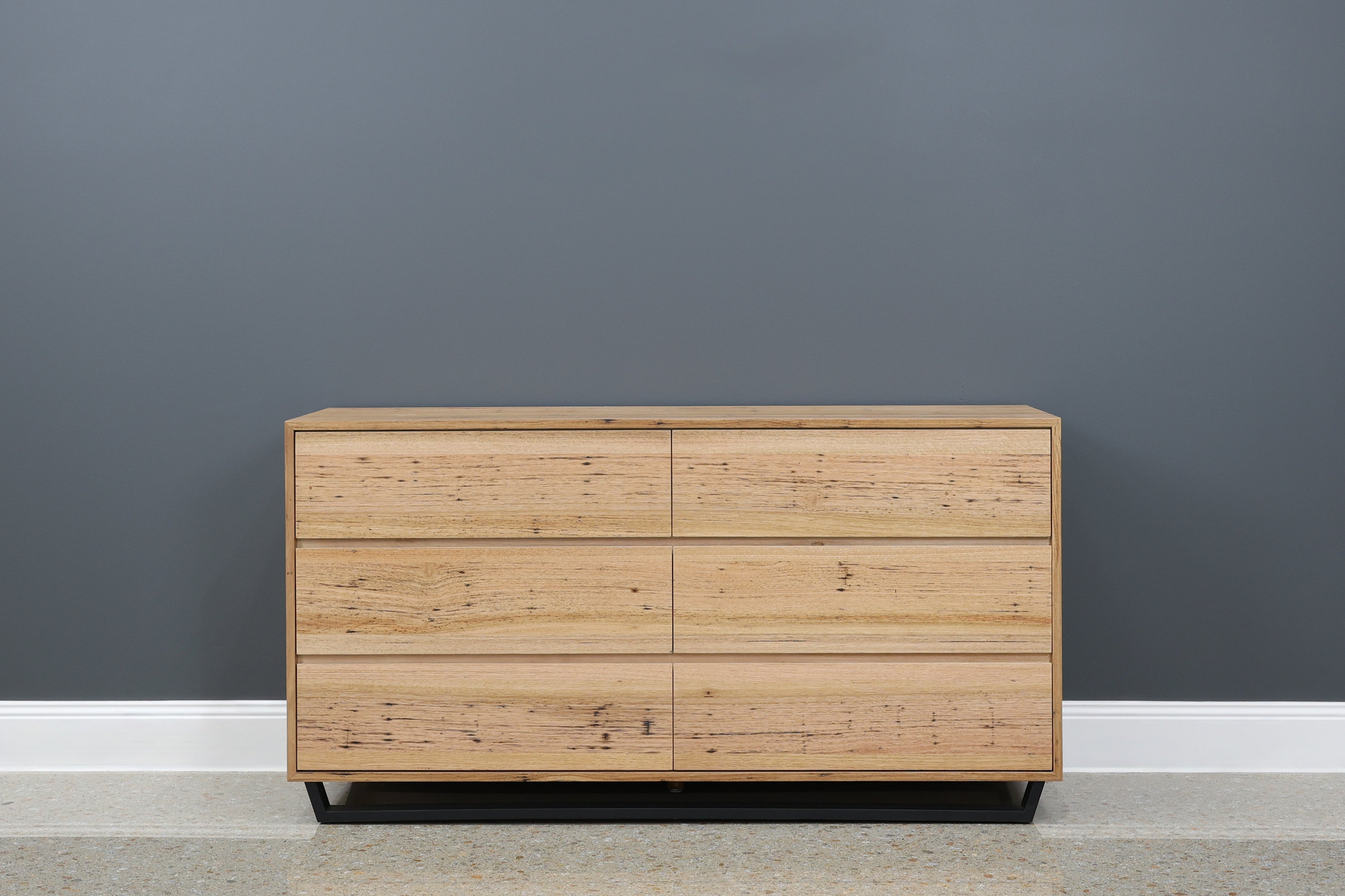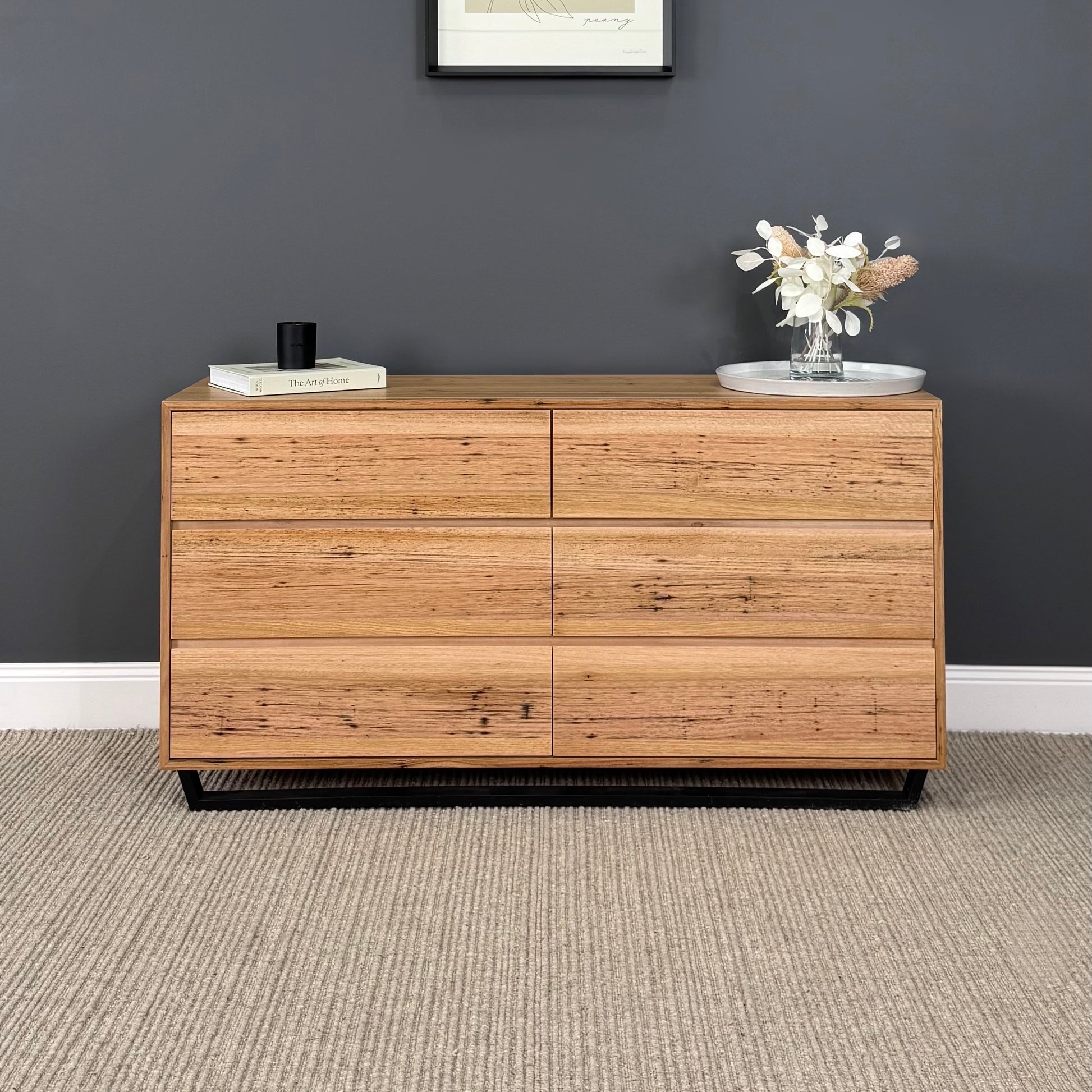 The Peninsula Dresser is a sleek and spacious storage solution that blends rustic charm with contemporary elegance, ideal for enhancing bedrooms or living spaces. Made from solid Wormy Chestnut timber veneer, it highlights the woods natural grain and rich tones. This dresser features six deep drawers, offering ample space for clothing, linens, or other personal items. Its clean-lined rectangular design sits atop a sturdy black base, adding subtle contrast and a touch of industrial flair. The timeless design ensures it will complement a variety of interior styles while offering practical functionality.