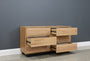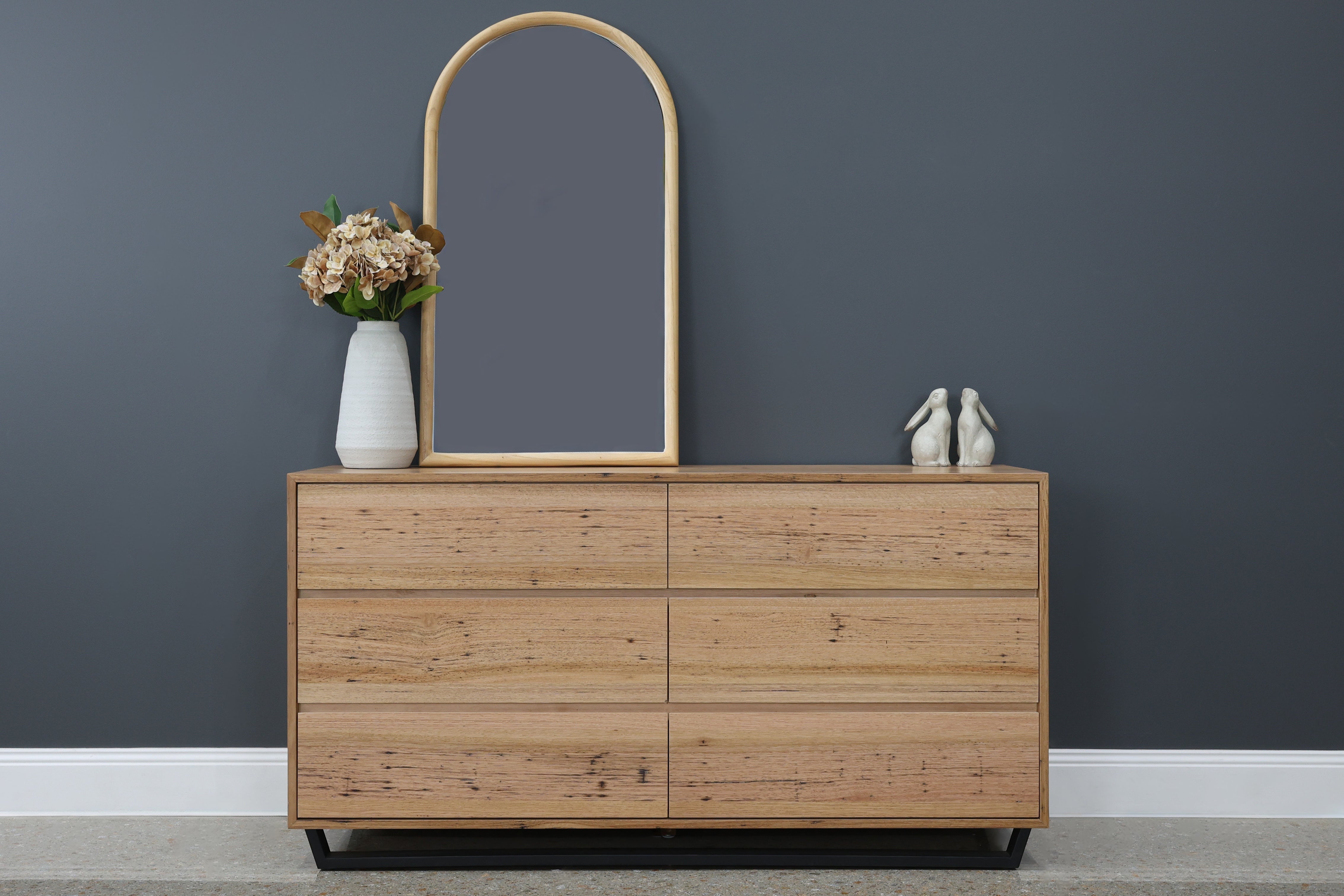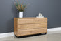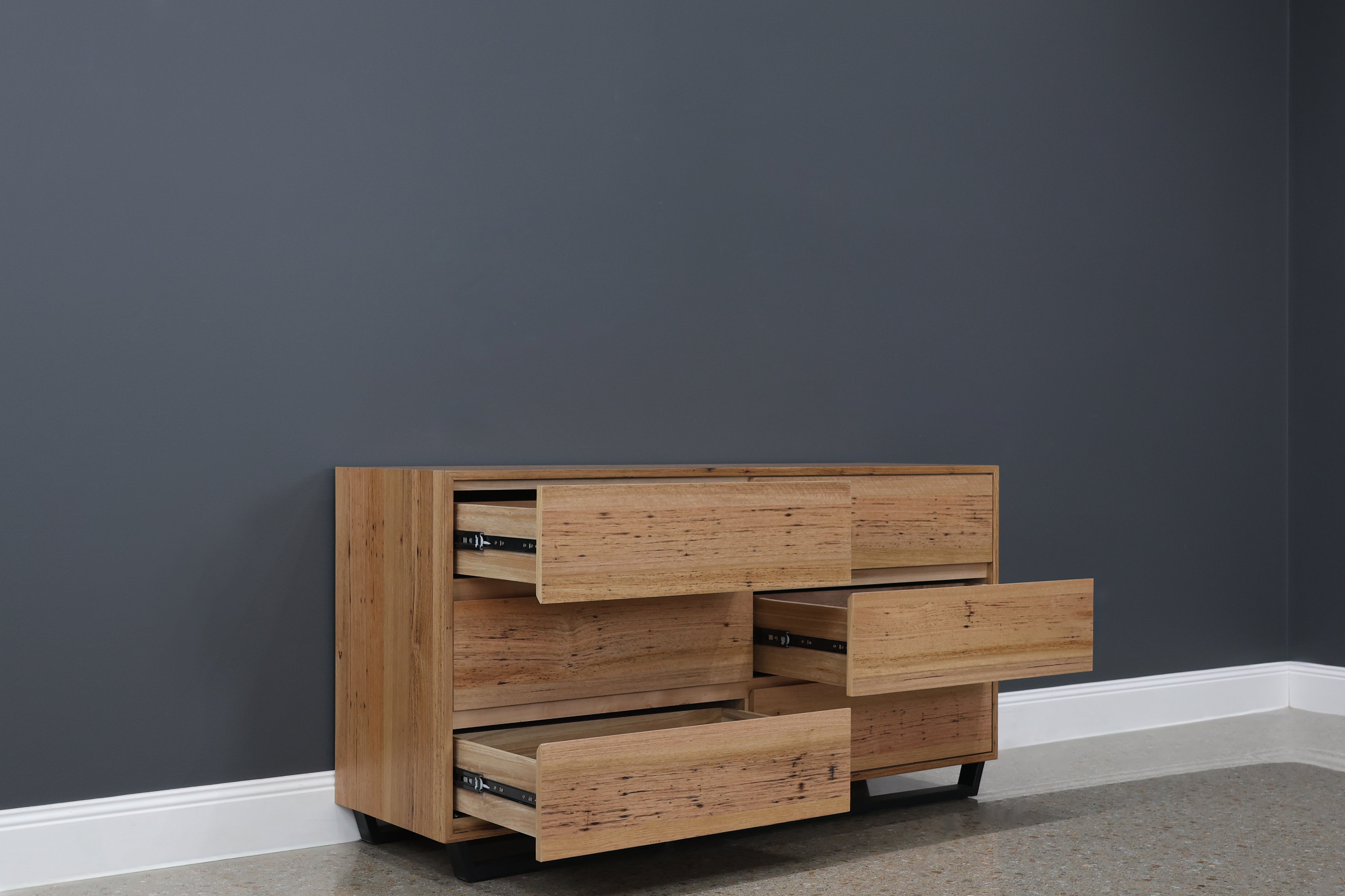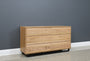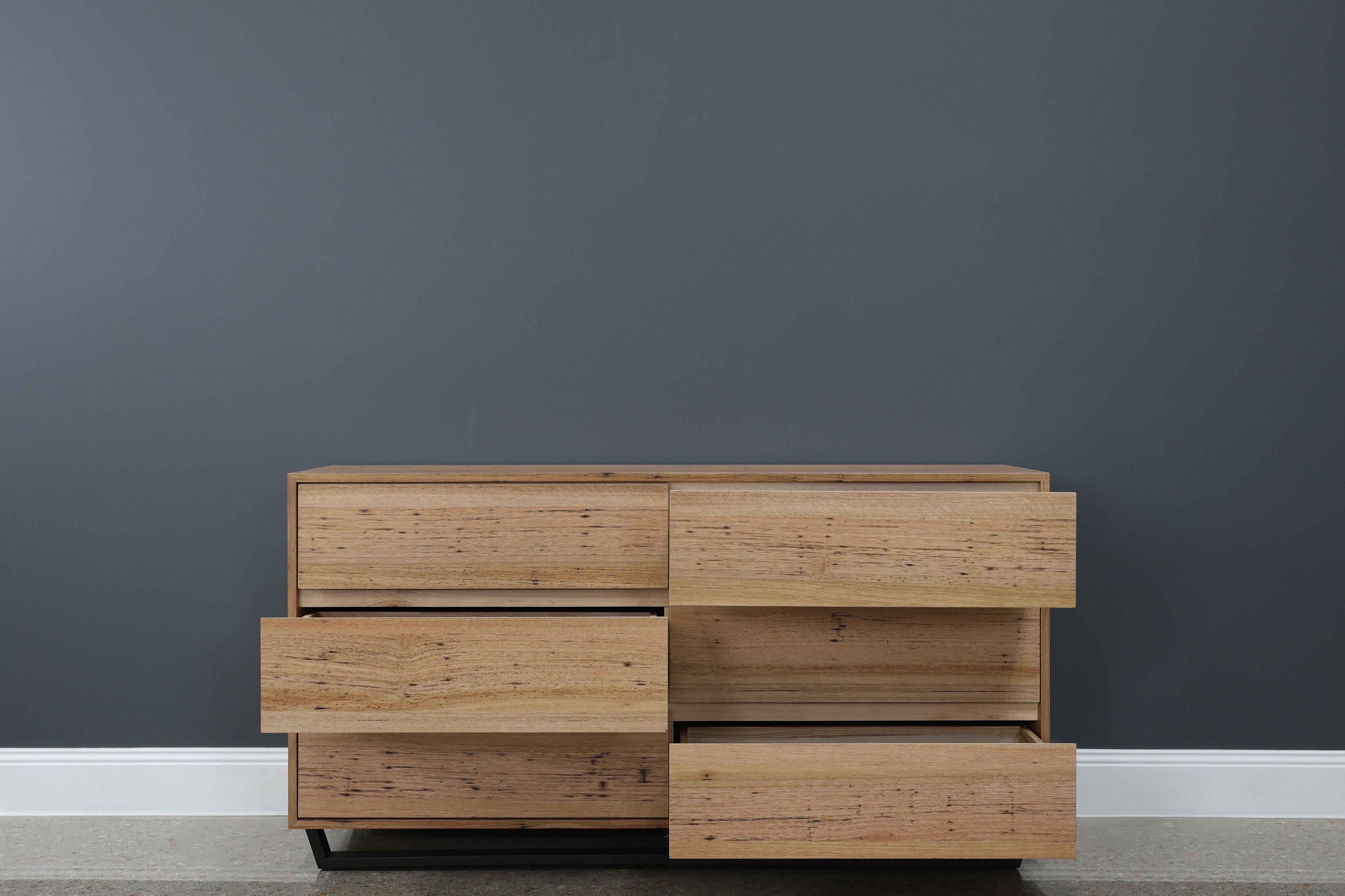 The Peninsula Dresser is a sleek and spacious storage solution that blends rustic charm with contemporary elegance, ideal for enhancing bedrooms or living spaces. Made from solid Wormy Chestnut timber veneer, it highlights the woods natural grain and rich tones. This dresser features six deep drawers, offering ample space for clothing, linens, or other personal items. Its clean-lined rectangular design sits atop a sturdy black base, adding subtle contrast and a touch of industrial flair. The timeless design ensures it will complement a variety of interior styles while offering practical functionality.