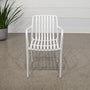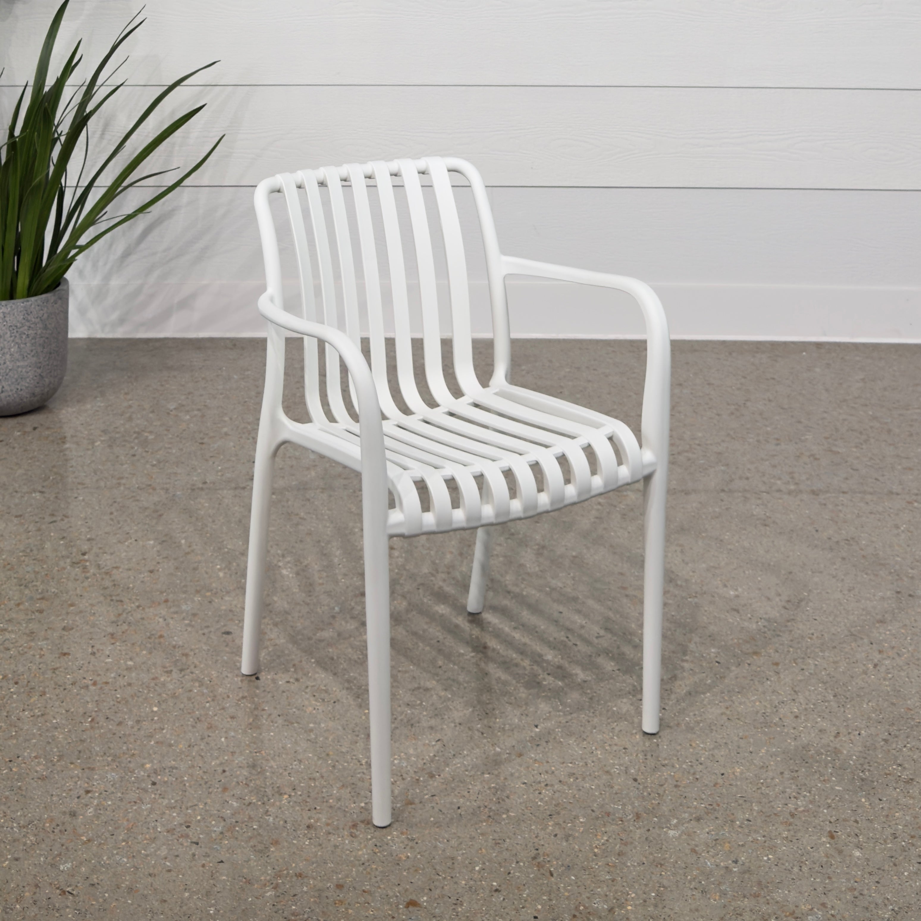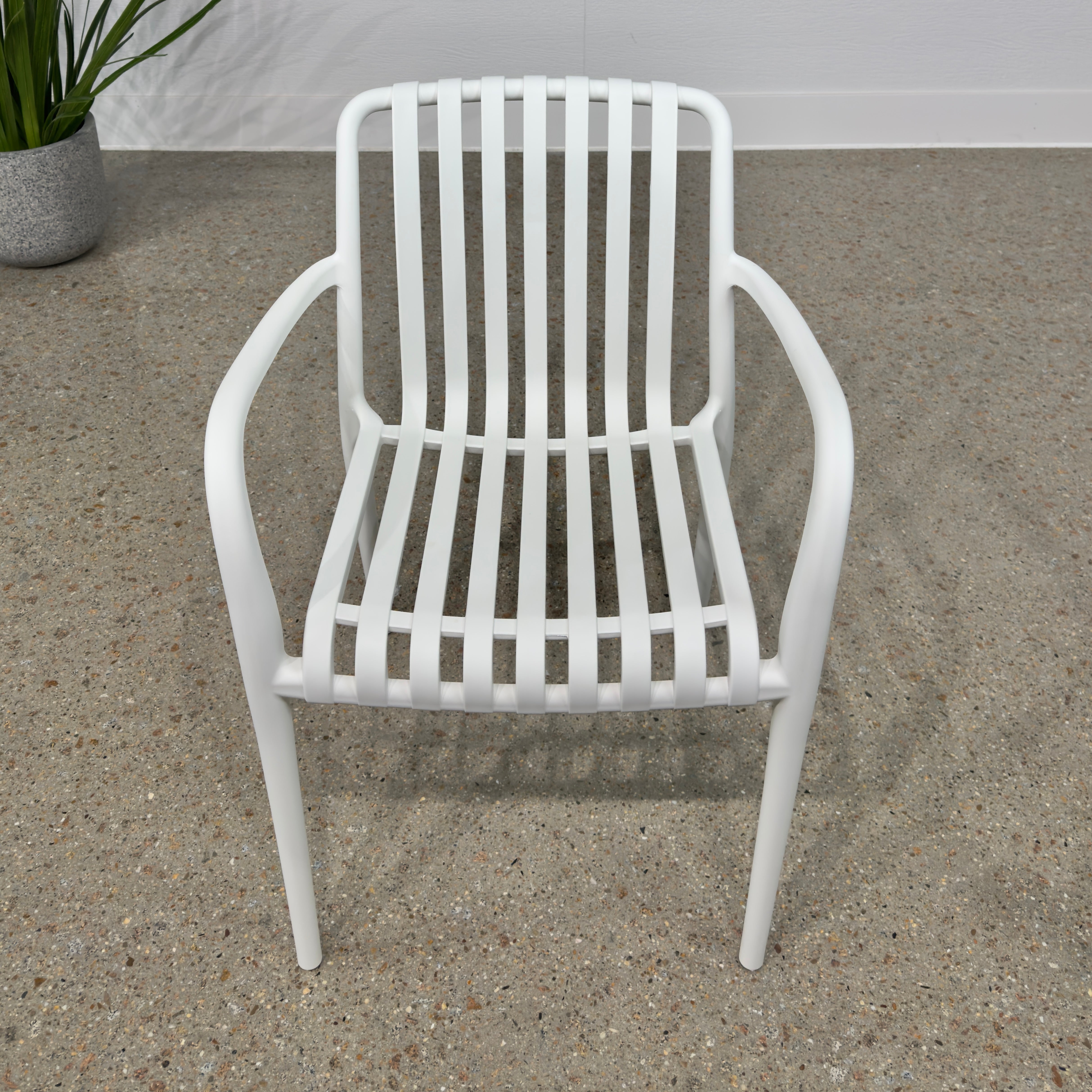 Elevate your outdoor space with the stylish and durable Roselle Dining Chair in White. Perfect for alfresco dining or commercial use, this chair combines modern design with exceptional durability, featuring armrests, a slat-style vertical back, and a slatted seat for a stylish yet functional look. Made from outdoor-grade, UV-resistant polypropylene, the Roselle Dining Chair is designed to withstand the elements and maintain its fresh, clean look over time.