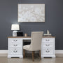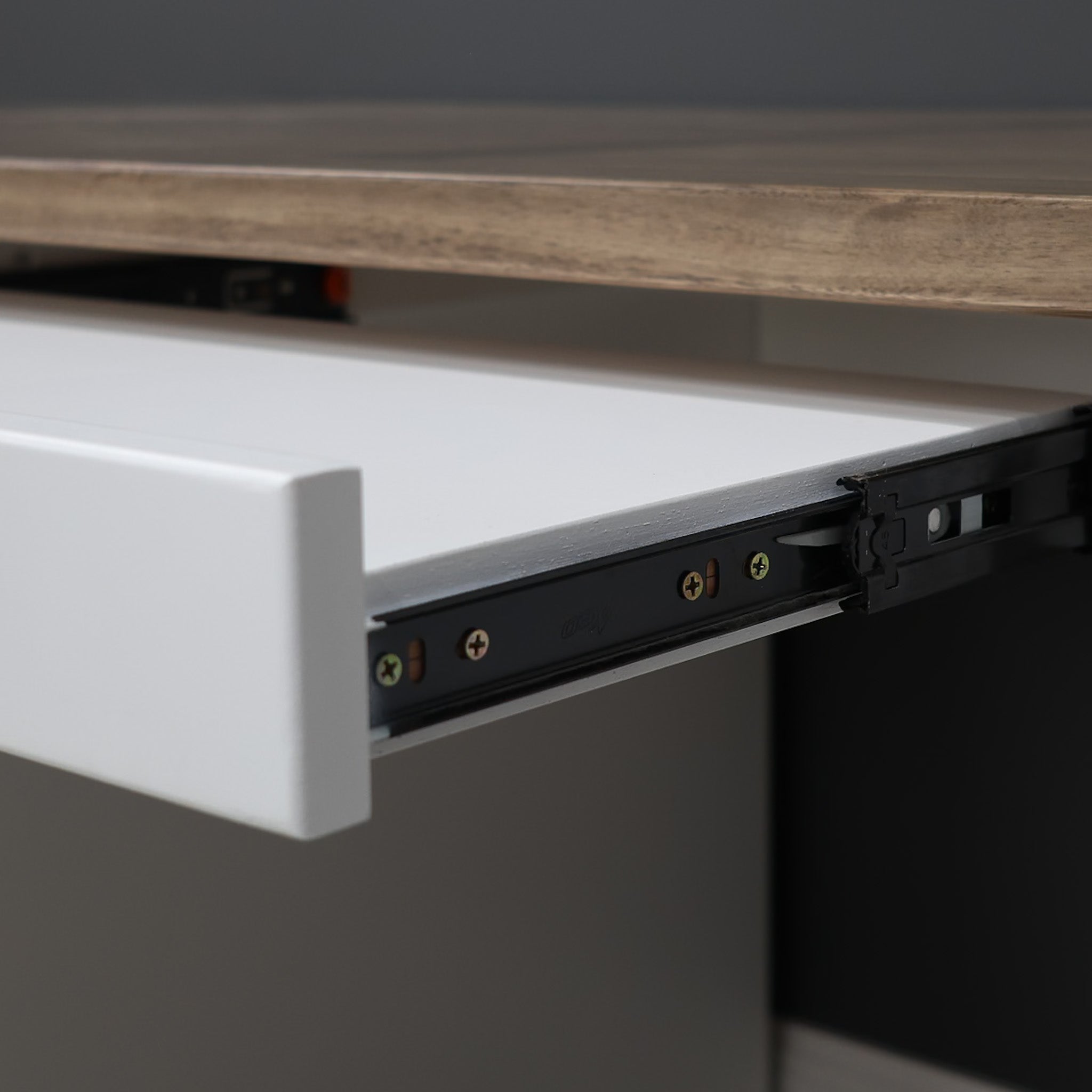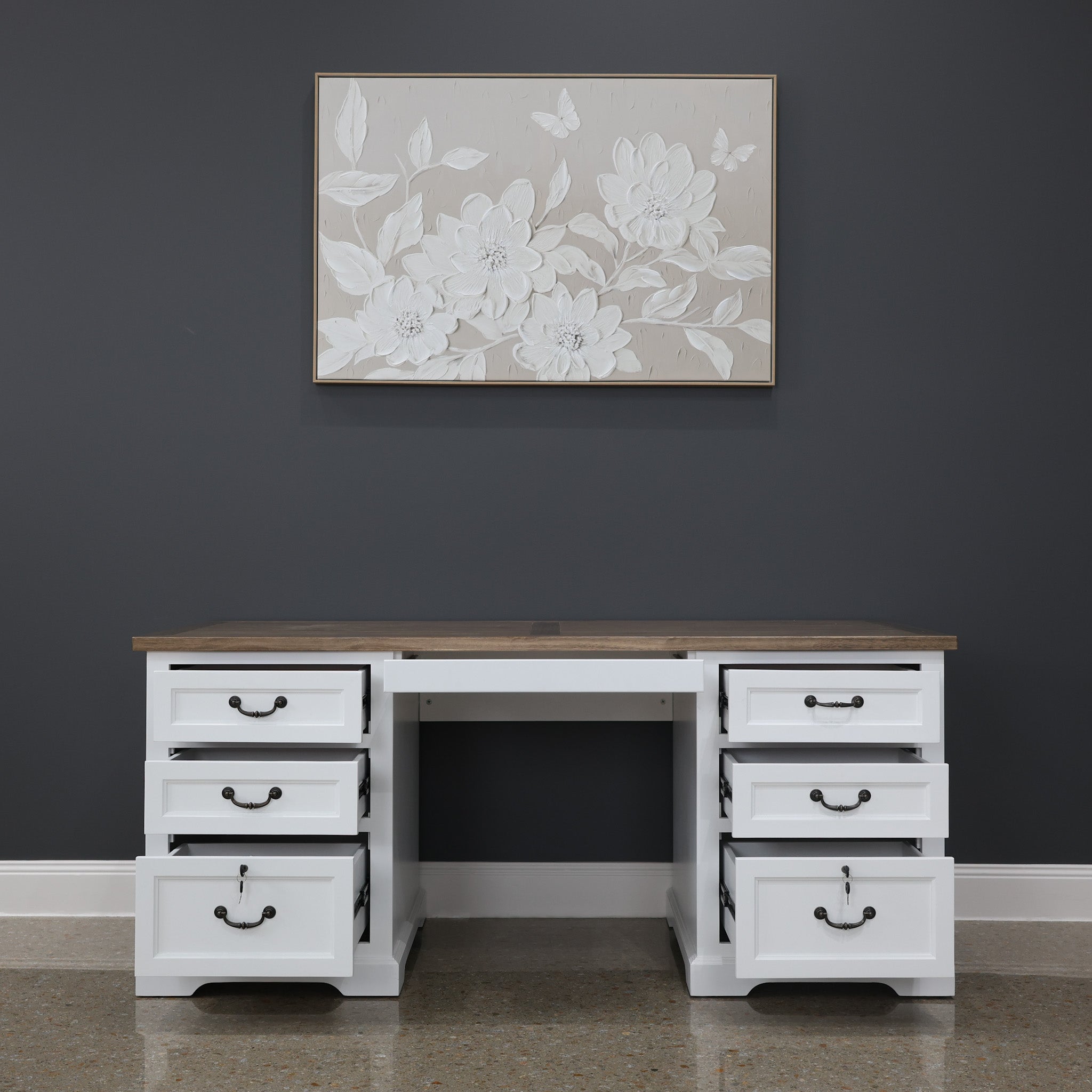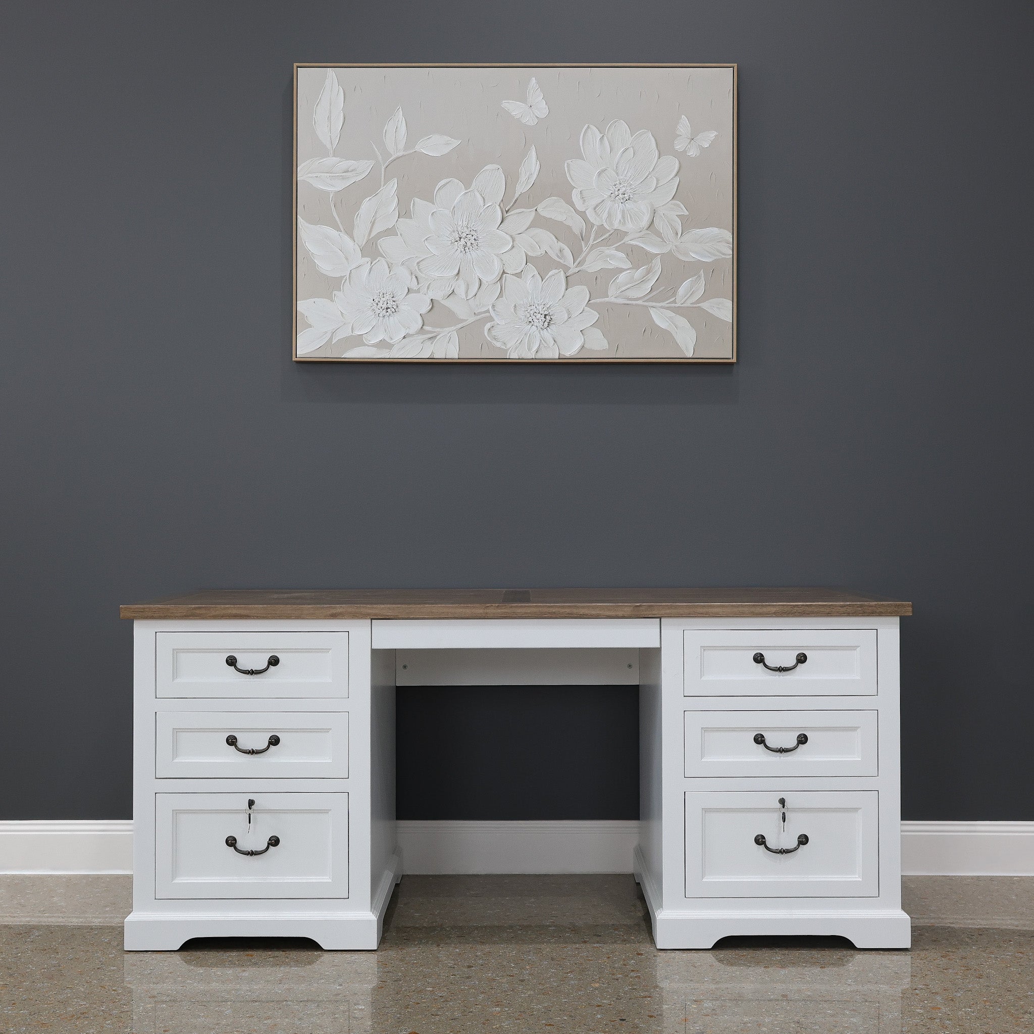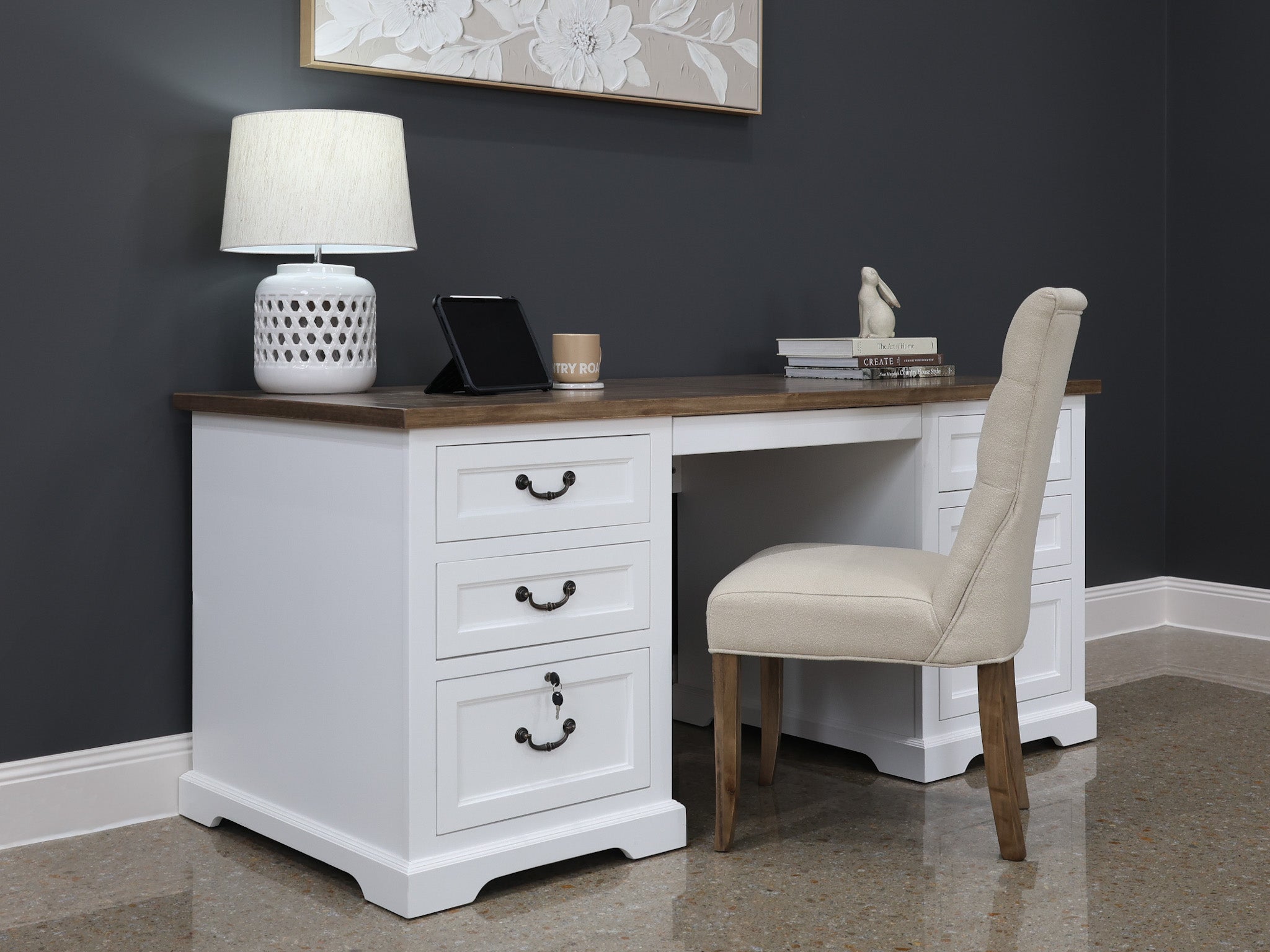 Introducing the Shellharbour 1800 Desk. Crafted from a blend of solid South American eucalyptus timber and pristine white craft wood, this desk is designed to elevate your workspace. The Shellharbour Desk boasts a spacious desktop that provides an expansive surface for creativity and productivity. With six felt-lined drawers on smooth extension runners, you'll have ample storage for all your essentials. The elegant drop handles add a refined finishing touch, while two lockable drawers provide the security you need for safeguarding confidential documents and valuables.