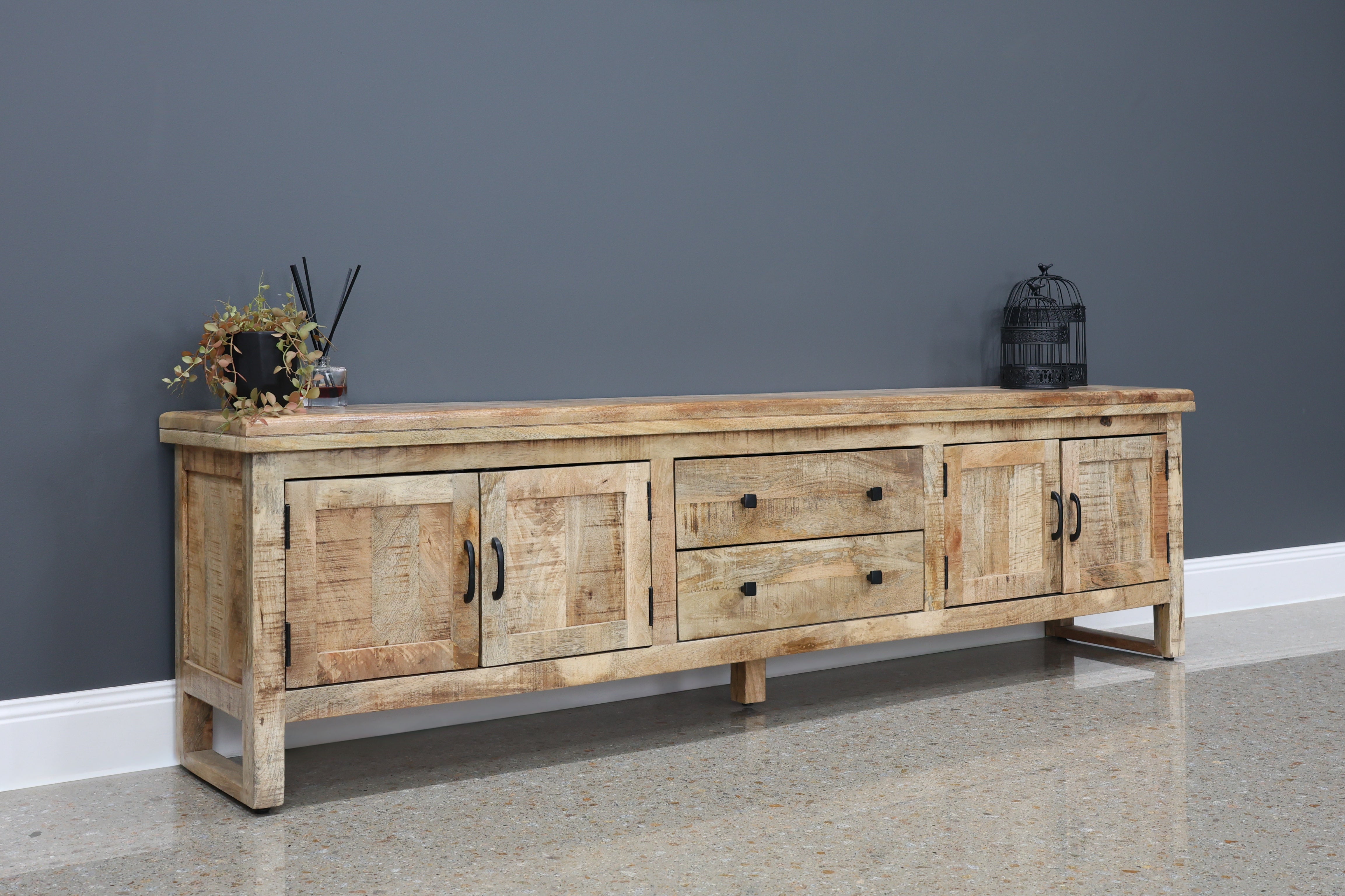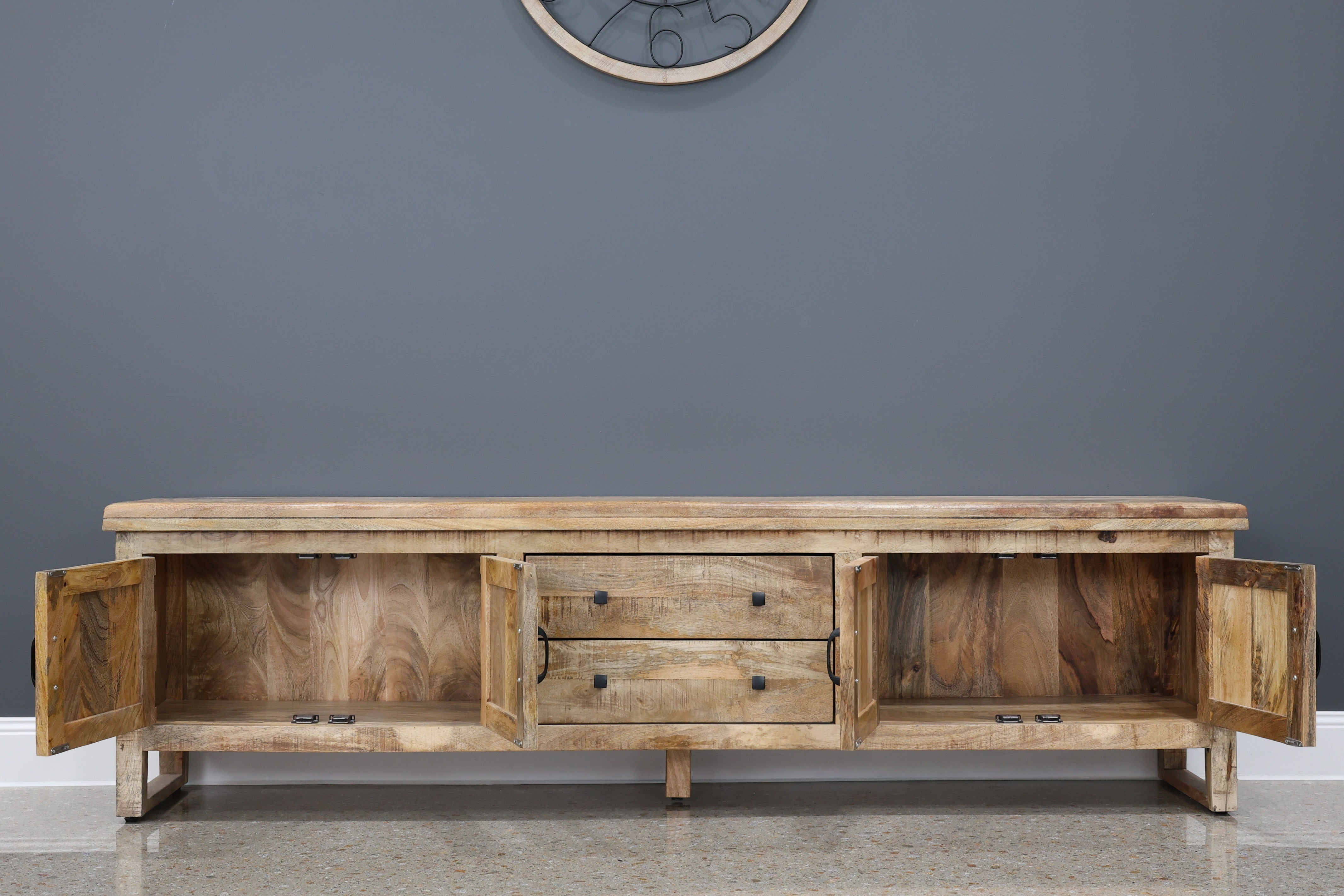The Whitfield TV unit is a stylish and practical entertainment piece crafted from solid timber with a natural wood finish that highlights its rustic charm. Its low-profile design features two central drawers flanked by two cabinet doors, offering a mix of concealed and open storage for media devices, cables, and accessories. The black metal handles add a modern contrast to the warm tones of the wood, while its sturdy construction ensures durability. This unit is perfect for organising your living room while maintaining a cohesive and timeless aesthetic.